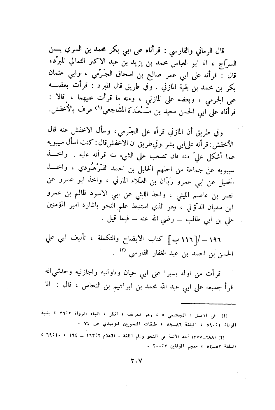 قَالَ الرماني والفارسي قرأناه على ابي بكر مُحَمَّد بن السّري بن السراج أَنا أَبُو الْعَبَّاس مُحَمَّد بن يزِيد بن عبد الْأَكْبَر الثمالِي الْمبرد قَالَ قرأته على ابي عمر صَالح بن إِسْحَاق الْجرْمِي وابي عُثْمَان بكر بن مُحَمَّد بن بَقِيَّة الْمَازِني