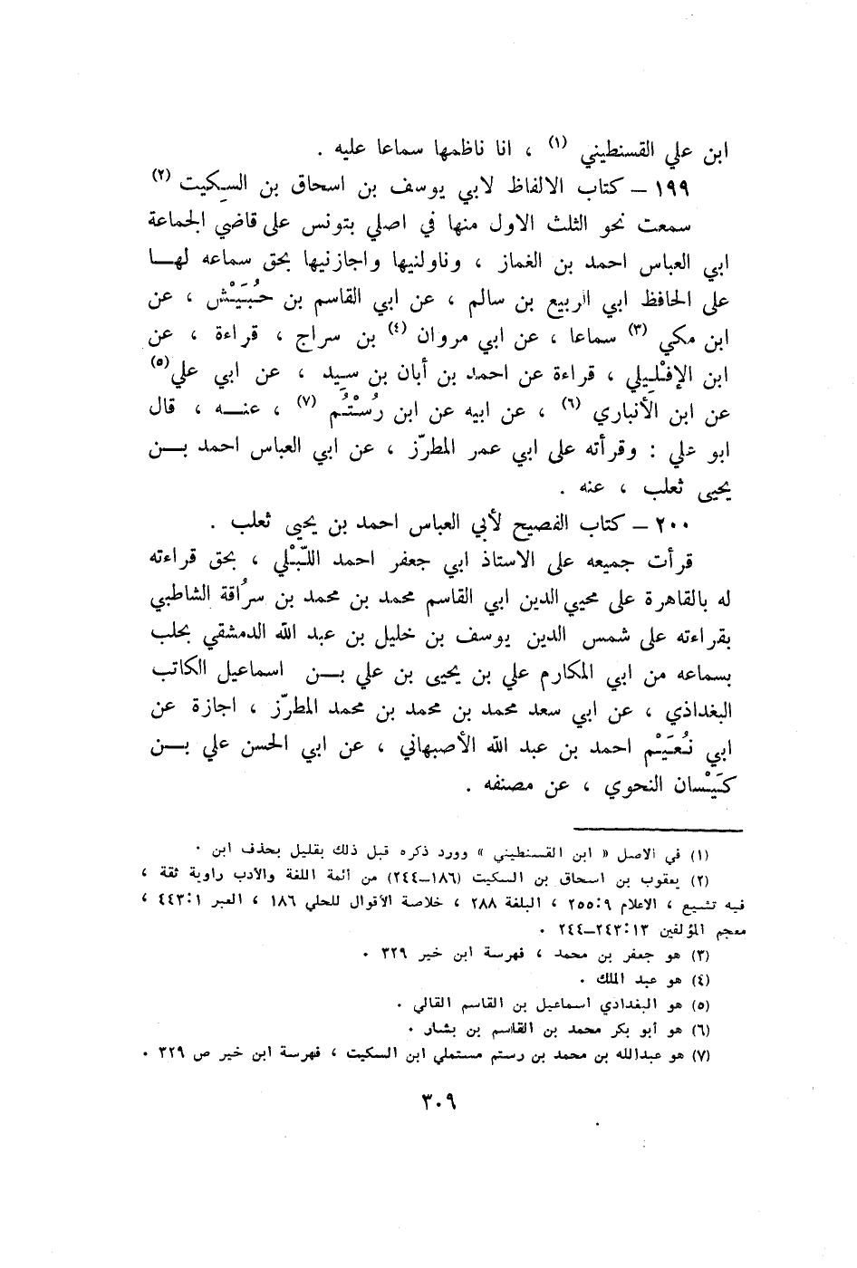 199 - كتاب الْأَلْفَاظ لابي يُوسُف بن إِسْحَاق بن السّكيت سَمِعت نَحْو الثُّلُث الأول مِنْهَا فِي أُصَلِّي بتونس على قَاضِي الْجَمَاعَة ابي الْعَبَّاس احْمَد بن الغماز وناولنيها وأجازنيها بِحَق سَمَاعه لَهَا على الْحَافِظ ابي الرّبيع بن سَالم عَن ابي الْقَاسِم بن حُبَيْش عَن ابْن مكي سَمَاعا عَن ابي مَرْوَان بن سراج قِرَاءَة عَن ابْن الإفليلي قِرَاءَة عَن أَحْمد بن أبان بن سيد عَن ابي عَليّ عَن ابْن الْأَنْبَارِي عَن ابيه عَن ابْن رستم عَنهُ قَالَ أَبُو عَليّ وقرأته على ابي عمر الْمُطَرز عَن ابي الْعَبَّاس أَحْمد بن يحيى ثَعْلَب عَنهُ