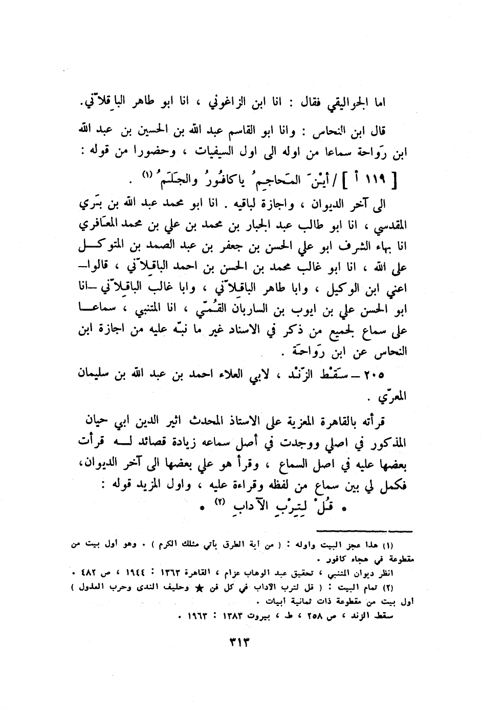 أَنا أَبُو مُحَمَّد عبد الله بن بري الْمَقْدِسِي أَنا أَبُو طَالب عبد الْجَبَّار بن مُحَمَّد بن عَليّ بن مُحَمَّد الْمعَافِرِي أَنا بهاء الشّرف أَبُو عَليّ الْحسن بن جَعْفَر بن عبد الصَّمد بن المتَوَكل على الله أَنا أَبُو غَالب مُحَمَّد بن الْحسن بن احْمَد الباقلاني قَالُوا أَعنِي ابْن الْوَكِيل وَأَبا طَاهِر الباقلاني وَأَبا غَالب الباقلاني أَنا أَبُو الْحسن عَليّ بن أَيُّوب بن الساربان القمي أَنا المتنبي سَمَاعا على سَماع لجَمِيع من ذكر فِي الاسناد غير مَا نبه عَلَيْهِ من اجازة ابْن النّحاس عَن ابْن رَوَاحَة