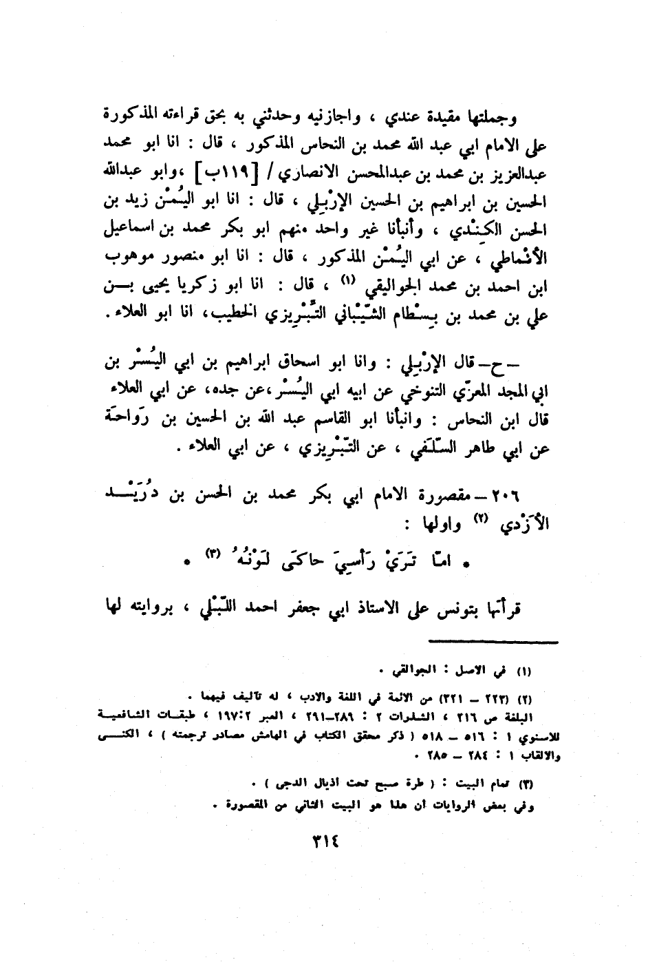 ح قَالَ الإربلي وَأَنا أَبُو إِسْحَاق إِبْرَاهِيم بن ابي الْيُسْر بن ابي الْمجد المعري التنوخي عَن ابيه ابي الْيُسْر عَن جده عَن ابي الْعَلَاء قَالَ ابْن النّحاس وأنبأنا أَبُو الْقَاسِم عبد الله بن الْحُسَيْن بن رَوَاحَة عَن ابي طَاهِر السلَفِي عَن التبريزي عَن ابي الْعَلَاء