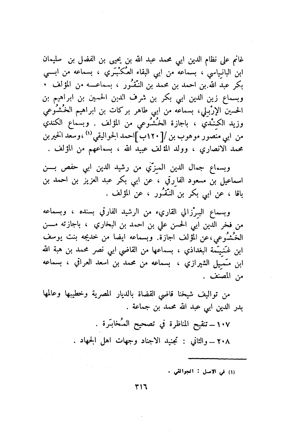 وبسماع البرزالي الْقَارئ من الرشيد الفارقي بِسَنَدِهِ وبسماعه من فَخر الدّين ابي الْحسن عَليّ بن احْمَد بن البُخَارِيّ بإجازته من الخشوعي عَن الْمُؤلف إجَازَة