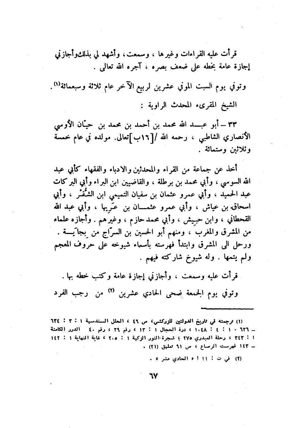 33 - أَبُو عبد الله مُحَمَّد بن أَحْمد بن مُحَمَّد بن حَيَّان الأوسي الْأنْصَارِيّ الشاطبي رَحمَه الله تَعَالَى مولده فِي عَام خَمْسَة وَثَلَاثِينَ وسِتمِائَة