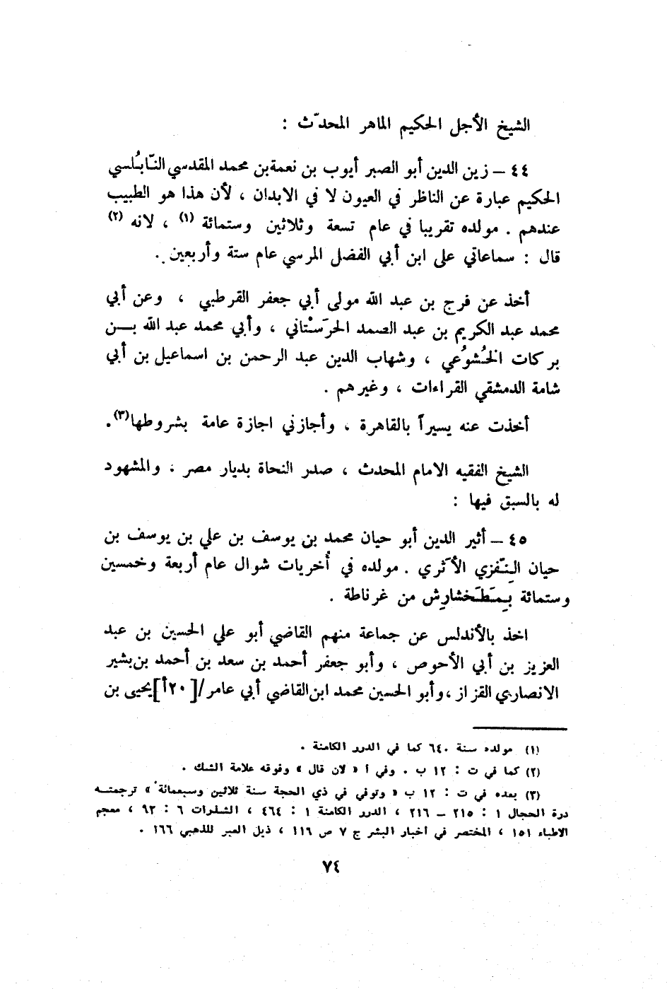 44 - زين الدّين أَبُو الصَّبْر أَيُّوب بن نعْمَة بن مُحَمَّد الْمَقْدِسِي النابلسي الْحَكِيم عبارَة عَن النَّاظر فِي الْعُيُون لَا فِي الْأَبدَان لِأَن هَذَا هُوَ الطَّبِيب عِنْدهم مولده تَقْرِيبًا فِي عَام تِسْعَة وَثَلَاثِينَ وسِتمِائَة لِأَنَّهُ قَالَ سماعاتي على ابْن ابي الْفضل المرسي عَام سِتَّة وَأَرْبَعين