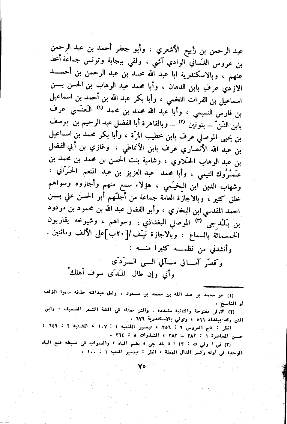 عبد الرَّحْمَن بن ربيع الْأَشْعَرِيّ وَأَبُو جَعْفَر أَحْمد بن عبد الرَّحْمَن بن عروس الغساني الْوَادي آشي وَلَقي ببجاية وتونس جمَاعَة أَخذ عَنْهُم وبالإسكندرية أَبَا عبد الله مُحَمَّد بن عبد الرَّحْمَن بن أَحْمد الْأَزْدِيّ عرف بِابْن الدهان وَأَبا مُحَمَّد عبد الْوَهَّاب بن الْحسن بن إِسْمَاعِيل بن الْفُرَات اللَّخْمِيّ وَأَبا بكر عبد الله بن أَحْمد بن إِسْمَاعِيل بن فَارس التَّمِيمِي وَأَبا عبد الله مُحَمَّد بن مُحَمَّد الْعَنسِي عرف بِابْن النن بنونين وبالقاهرة أَبَا الْفضل عبد الرَّحِيم بن يُوسُف بن يحيى الْموصِلِي عرف بِابْن خطيب المزة وَأَبا بكر مُحَمَّد بن إِسْمَاعِيل بن عبد الله الْأنْصَارِيّ عرف بِابْن الْأنمَاطِي وغازي بن ابي الْفضل بن عبد الْوَهَّاب الحلاوي وشامية بنت الْحسن بن مُحَمَّد بن مُحَمَّد بن عمروك التَّيْمِيّ وَأَبا مُحَمَّد عبد الْعَزِيز بن عبد الْمُنعم الْحَرَّانِي وشهاب الدّين ابْن الخيمي هَؤُلَاءِ سمع مِنْهُم وأجازوه وسواهم خلق كثير وبالإجازة الْعَامَّة جمَاعَة من أَجلهم أَبُو الْحسن عَليّ بن أَحْمد الْمَقْدِسِي ابْن البُخَارِيّ وَأَبُو الْفضل عبد الله بن مَحْمُود بن مودود بن بلدجى الْموصِلِي الْبَغْدَادِيّ وسواهم وشيوخه يقاربون الْخَمْسمِائَةِ بِالسَّمَاعِ بِالْإِجَازَةِ نَيف على الْألف وَمِائَتَيْنِ