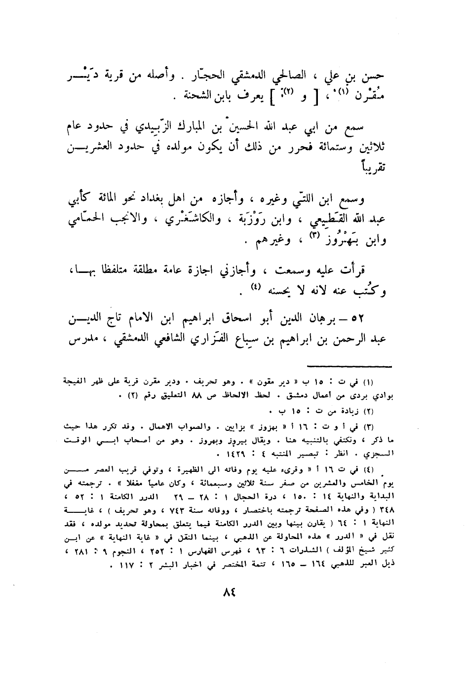 52 - برهَان الدّين أَبُو إِسْحَاق إِبْرَاهِيم ابْن الإِمَام تَاج الدّين عبد الرَّحْمَن بن إِبْرَاهِيم بن سِبَاع الْفَزارِيّ الشَّافِعِي الدِّمَشْقِي مدرس
