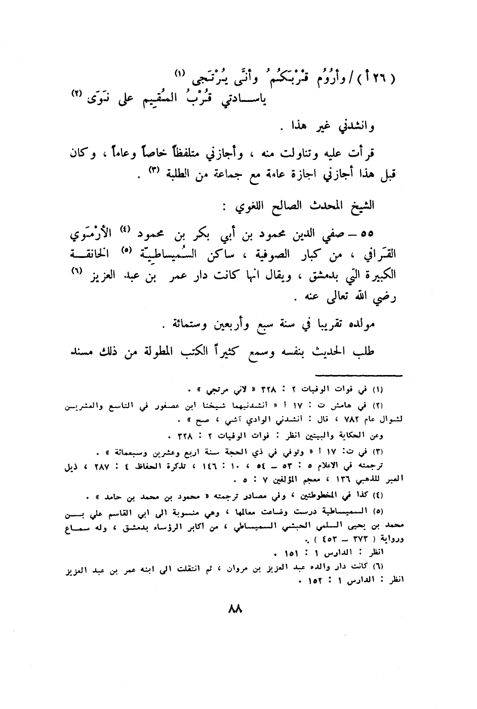 55 - صفي الدّين مَحْمُود بن ابي بكر بن مَحْمُود الأرموي الْقَرَافِيّ من كبار الصُّوفِيَّة سَاكن السميساطية الخانقة الْكَبِيرَة الَّتِي بِدِمَشْق وَيُقَال انها كَانَت دَار عمر بن عبد الْعَزِيز رَضِي الله تَعَالَى عَنهُ.