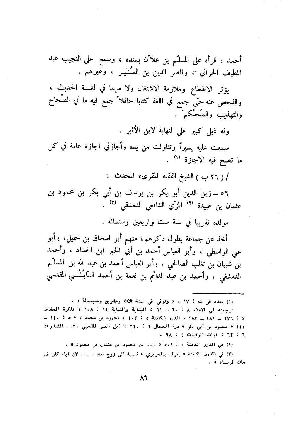 أَحْمد قَرَأَهُ على الْمُسلم بن عَلان بِسَنَدِهِ وَسمع على النجيب عبد اللَّطِيف الْحَرَّانِي وناصر الدّين بن الْمُنِير وَغَيرهم.