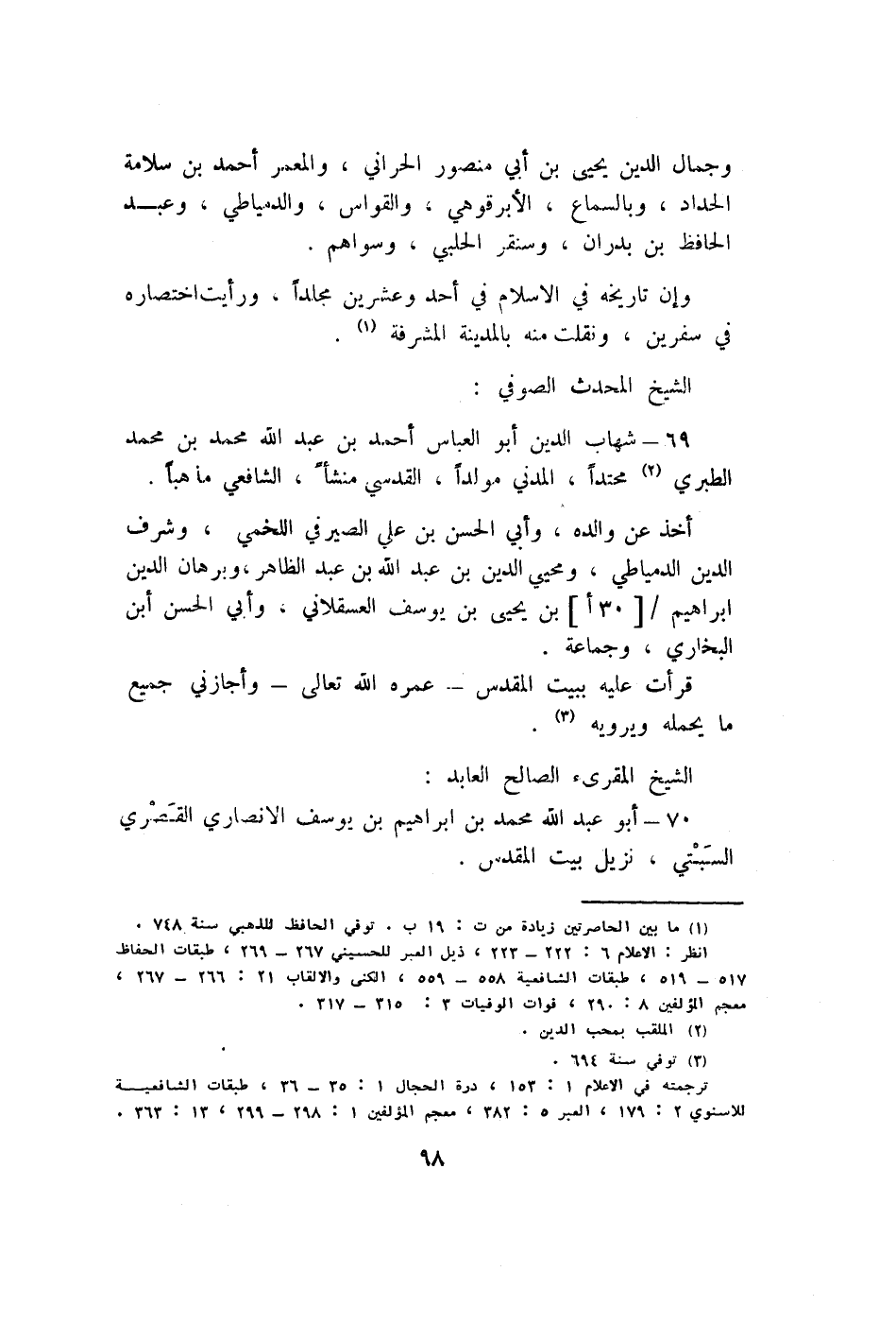 69 - شهَاب الدّين أَبُو الْعَبَّاس أَحْمد بن عبد الله مُحَمَّد بن مُحَمَّد الطَّبَرِيّ محتدا الْمدنِي مولدا الْقُدسِي منشأ الشَّافِعِي مذهبا