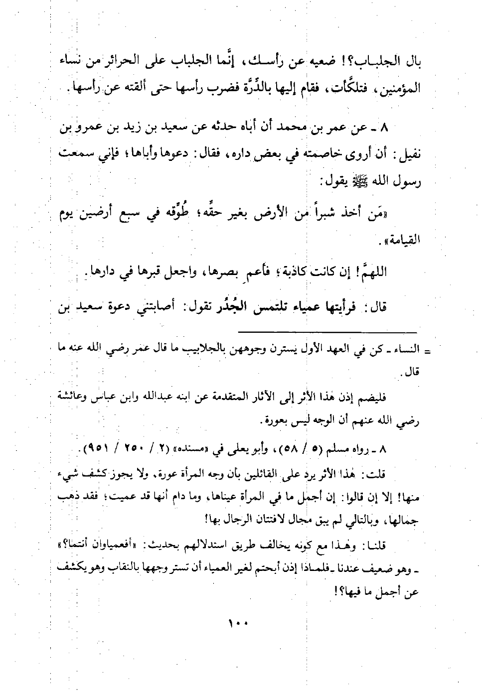 قلنا: وهذا مع كونه يخالف طريق استدلالهم بحديث: "أفعمياوان أنتما؟ " -وهو ضعيف عندنا- فلماذا إذن أبحتم لغير العميان أن تستر وجهها بالنقاب وهو يكشف عن أجمل ما فيها؟!.