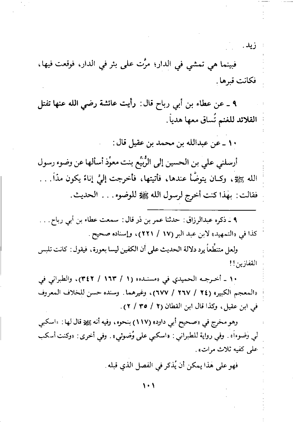 أرسلني علي بن الحسين إلى الرُّبَيِّع بنت معوذ أسألها عن وضوء رسول الله -صلى الله عليه وسلم- وكان يتوضأ عندها فأتيتها فأخرجت إلَيَّ إناء يكون مدًّا ... فقالت: بهذا كنت أخرج لرسول الله -صلى الله عليه وسلم- للوضوء ... الحديث.