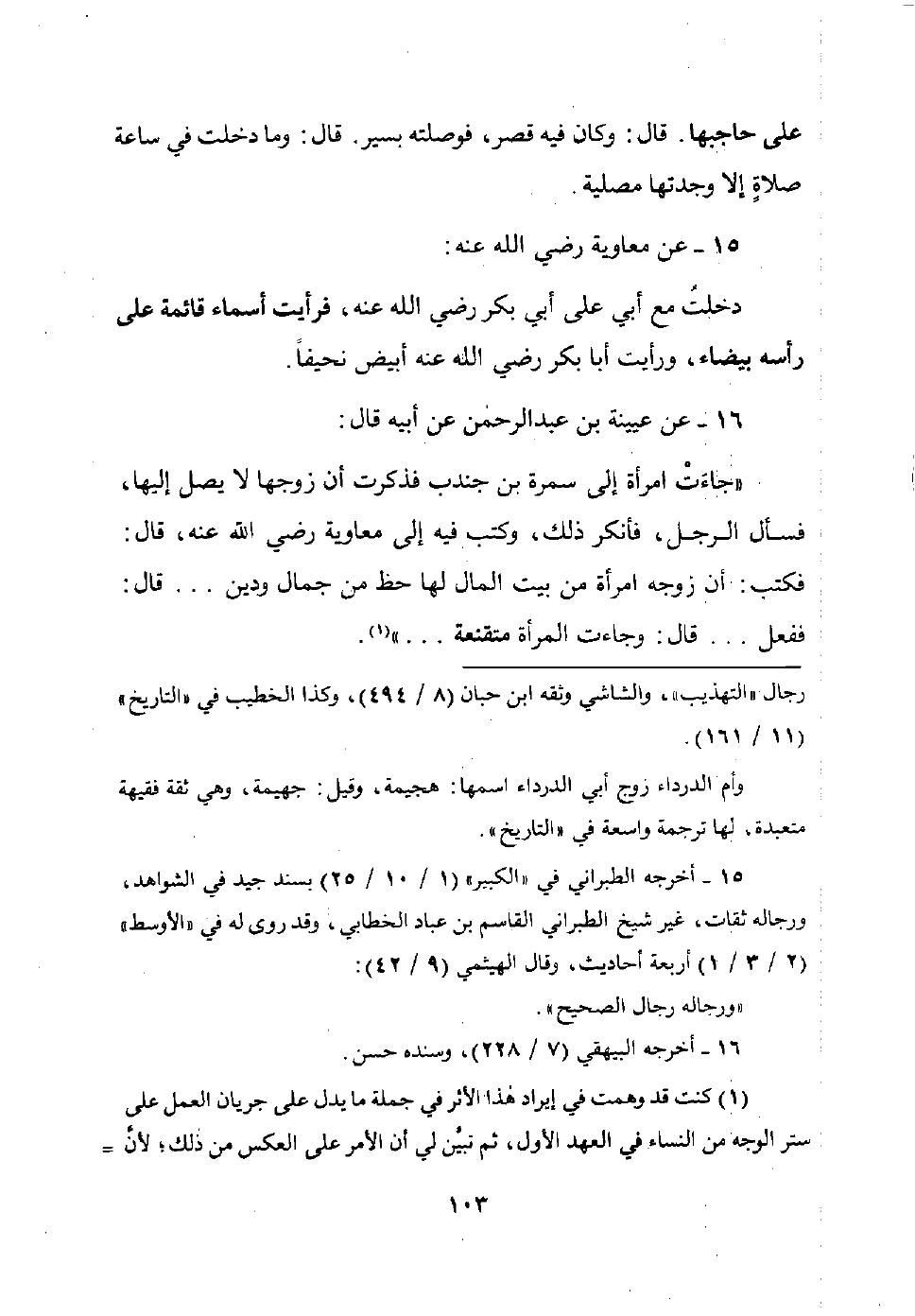 1 كنت قد وهمت في إيراد هذا الأثر في جملة ما يدل على جريان العمل على ستر الوجه من النساء في العهد الأول، ثم تبين لي أن الأمر على العكس من ذلك؛ لأن التقنع هو ستر المرأة لرأسها دون وجهها؛ كما شرحته في مقدمة هذه الطبعة؛ فهو من الأدلة الكثيرة التي لا ترضي المتعصبين لمذاهبهم والمتشددين في أقوالهم، والله أعلم بسلوكهم مع نسائهم، ولذلك نقلت هذا الأثر إلى هنا.