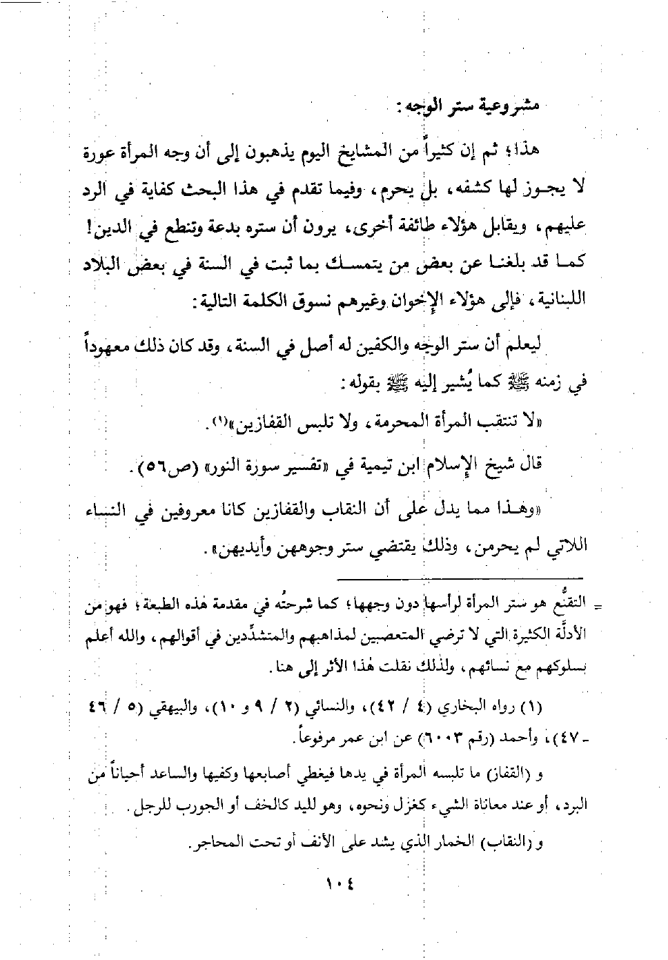 هذا ثم إن كثيرًا من المشايخ اليوم يذهبون إلى أن وجه المرأة عورة لا يجوز لها كشفه بل يحرم وفيما تقدم في هذا البحث كفاية في الرد عليهم، ويقابل هؤلاء طائفة أخرى يرون أن ستره بدعة وتنطع في الدين، كما قد بلغنا عن بعض من يتمسك بما ثبت في السنة في بعض البلاد اللبنانية، فإلى هؤلاء الإخوان وغيرهم نسوق الكلمة التالية: