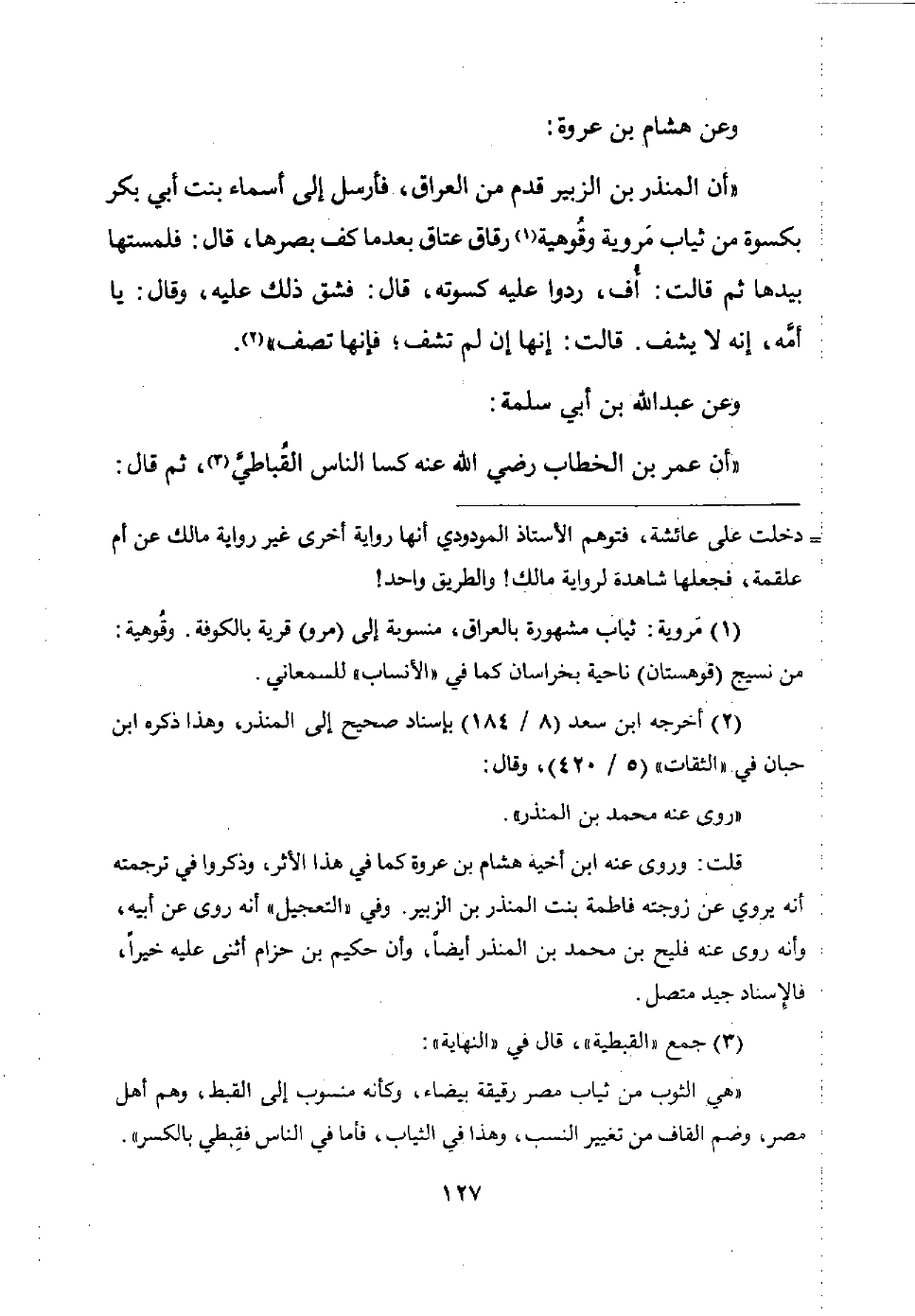 قلت: وروى عنه ابن أخيه هشام بن عروة كما في هذا الأثر، وذكروا في ترجمته أنه يروي عن زوجته فاطمة بنت المنذر بن الزبير. وفي "التعجيل" أنه روى عن أبيه، وأنه روى عنه فليح بن محمد بن المنذر أيضًا، وأن حكيم بن حزام أثنى عليه خيرًا، فالإسناد جيد متصل.