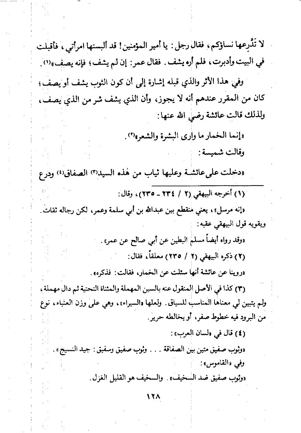 لا تَدَّرِعها نساؤكم فقال رجل: يا أمير المؤمنين قد ألبستها امرأتي فأقبلت في البيت وأدبرت فلم أره يشف. فقال عمر: إن لم يكن يشف فإنه يصف"1.