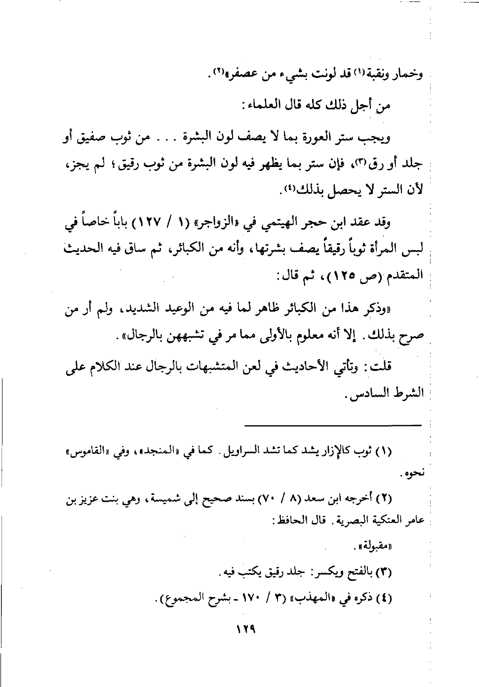 وقد عقد ابن حجر الهيتمي في "الزواجر" "1/ 127" بابًا خاصًّا في لبس المرأة ثوبًا رقيقًا يصف بشرتها وأنه من الكبائر ثم ساق فيه الحديث المتقدم "ص 125" ثم قال:
