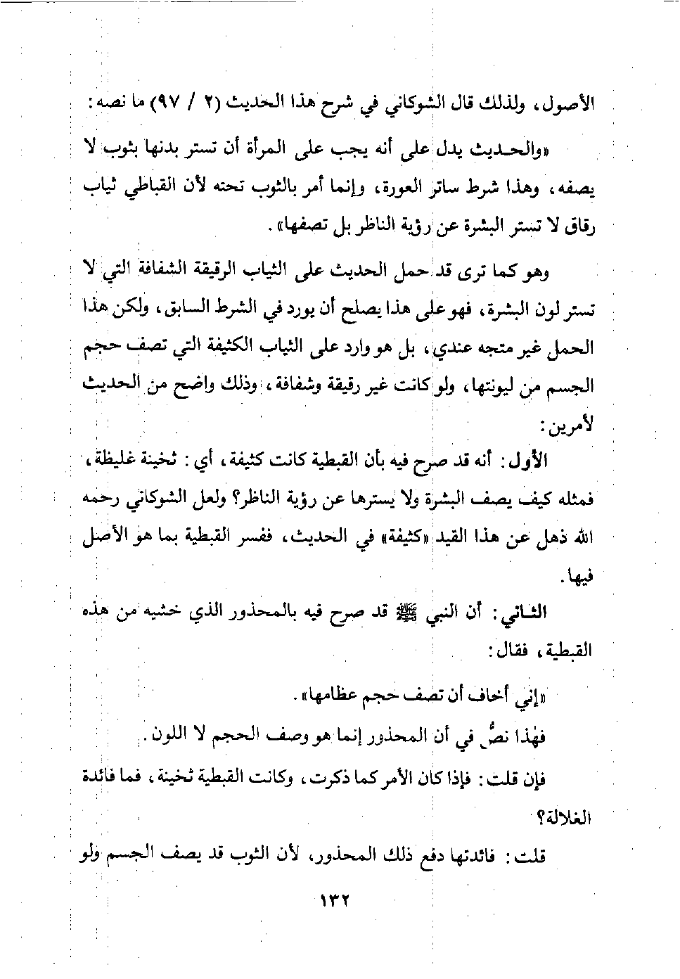 الأول: أنه قد صرح فيه بأن القبطية كانت كثيفة أي: ثخينة غليظة فمثله كيف يصف البشرة ولا يسترها عن رؤية الناظر؟ ولعل الشوكاني رحمه الله ذهل عن هذا القيد "كثيفة" في الحديث ففسر القبطية بما هو الأصل فيها.