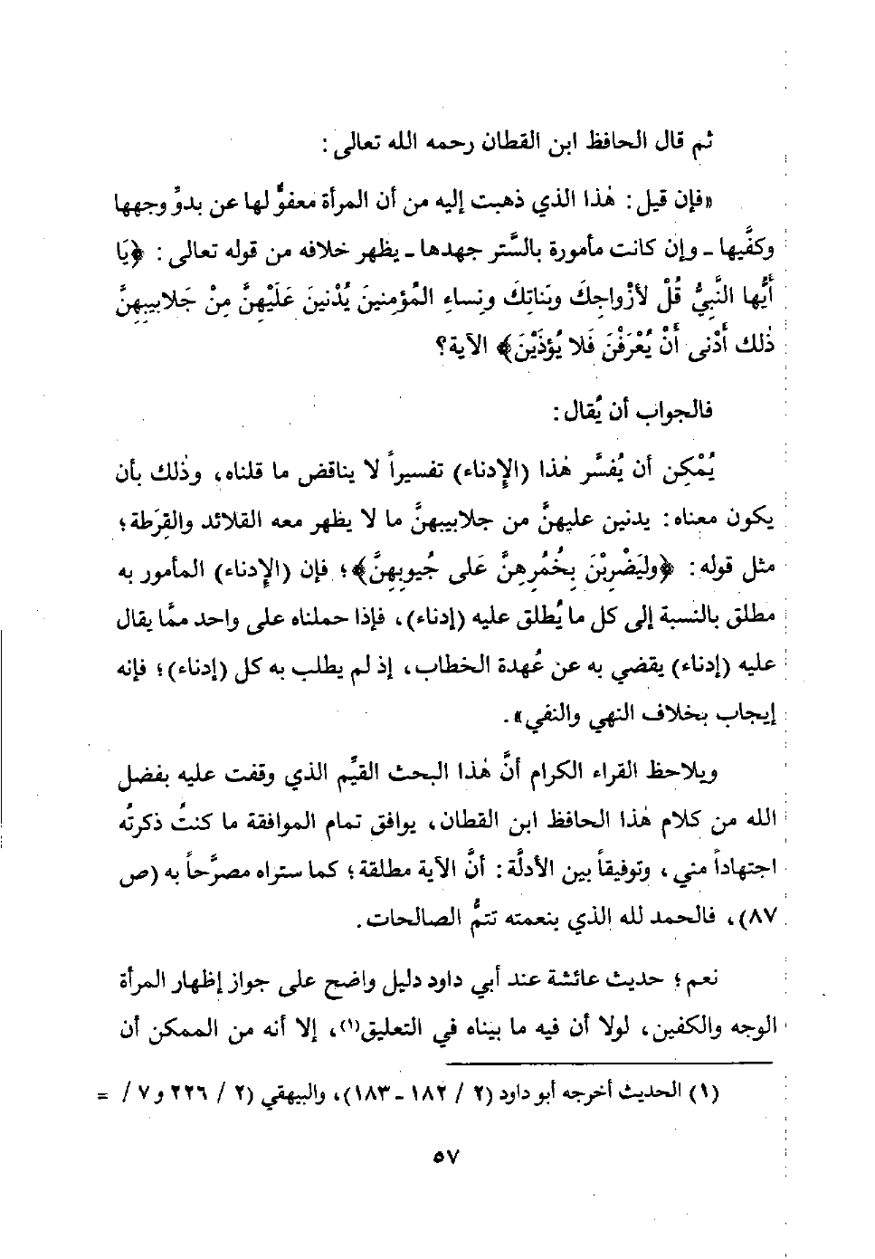 "فإن قيل: هذا الذي ذهبت إليه من أن المرأة معفو لها عن بدو وجهها وكفيها -وإن كانت مأمورة بالستر جهدها- يظهر خلافه من قوله تعالى: {يَا أَيُّهَا النَّبِيُّ قُلْ لأَزْوَاجِكَ وَبَنَاتِكَ وَنِسَاءِ الْمُؤْمِنِينَ يُدْنِينَ عَلَيْهِنَّ مِنْ جَلابِيبِهِنَّ ذَلِكَ أَدْنَى أَنْ يُعْرَفْنَ فَلا يُؤْذَيْنَ} الآية؟