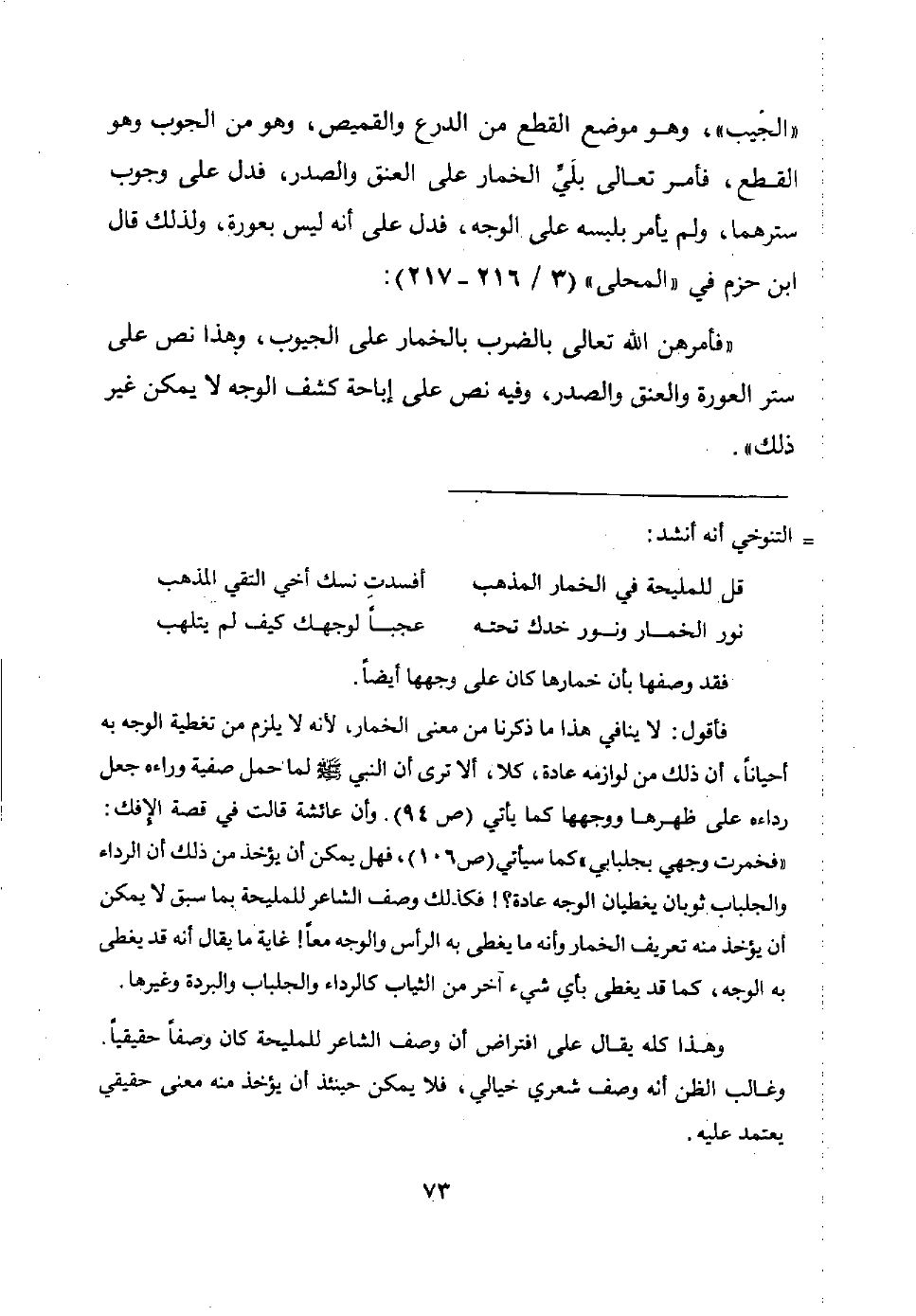 فأقول: لا ينافي هذا ما ذكرنا من معنى الخمار؛ لأنه لا يلزم من تغطية الوجه به أحيانًا، أن ذلك من لوازمه عادة، كلا، ألا ترى أن النبي -صلى الله عليه وسلم- لما حمل صفية وراءه جعل رداءه على ظهرها وجهها كما يأتي "ص94". وأن عائشة قالت في قصة الإفك: "فخمرت وجهي بجلبابي" كما سيأتي "ص106"، فهل يمكن أن يؤخذ من ذلك أن الرداء والجلباب ثوبان يغطيان الوجه عادة؟! فكذلك وصف الشاعر للمليحة بما سبق لا يمكن أن يؤخذ منه تعريف الخمار وأنه ما يغطى به الرأس والوجه معًا! غاية ما يقال أنه قد يغطى به الوجه، كما قد يغطى بأي شيء آخر من الثياب كالرداء والجلباب والبردة وغيرها.