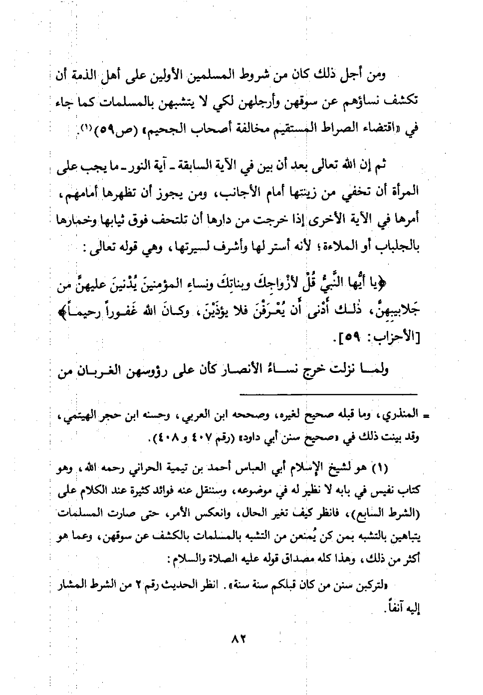 ومن أجل ذلك كان من شروط المسلمين الأولين على أهل الذمة أن تكشف نساؤهم عن سوقهن وأرجلهن لكي لا يتشبهن بالمسلمات كما جاء في "اقتضاء الصراط المستقيم مخالفة أصحاب الجحيم" "ص 59"1.