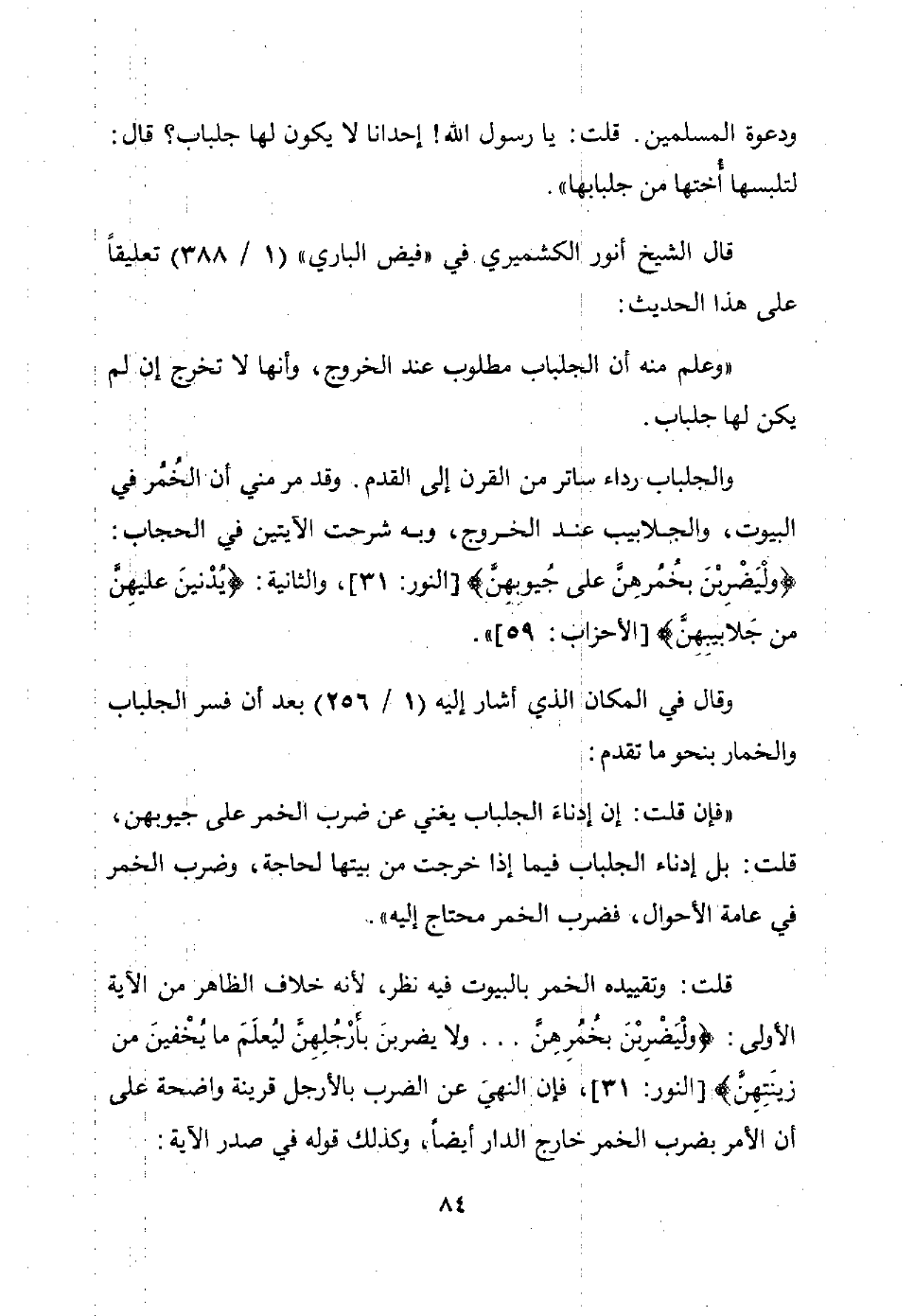 "فإن قلت: إن إدناء الجلباب يغني عن ضرب الخمر على جيوبهن قلت: بل إدناء الجلباب فيما إذا خرجت من بيتها لحاجة وضرب الخمر في عامة الأحوال فضرب الخمر محتاج إليه".