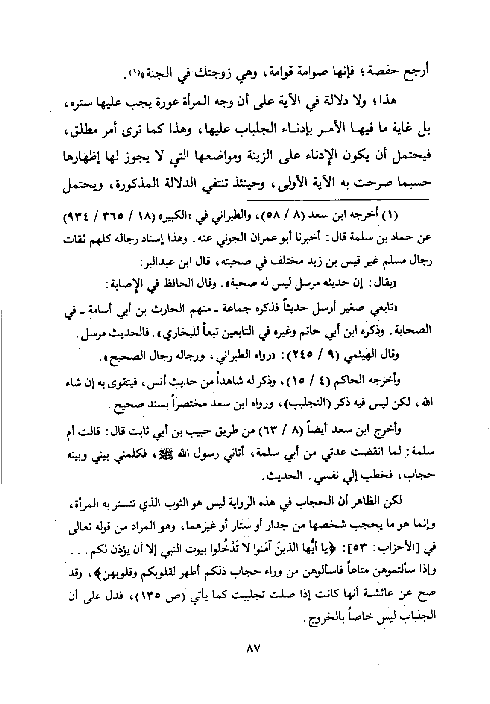 لكن الظاهر أن الحجاب في هذه الرواية ليس هو الثوب الذي تتستر به المرأة، وإنما هو ما يحجب شخصها من جدار أو ستار أو غيرهما، وهو المراد من قوله تعالى في [الأحزاب: 53] : {يَا أَيُّهَا الَّذِينَ آَمَنُوا لَا تَدْخُلُوا بُيُوتَ النَّبِيِّ إِلَّا أَنْ يُؤْذَنَ لَكُمْ} ...... {وَإِذَا سَأَلْتُمُوهُنَّ مَتَاعًا فَاسْأَلُوهُنَّ مِنْ وَرَاءِ حِجَابٍ ذَلِكُمْ أَطْهَرُ لِقُلُوبِكُمْ وَقُلُوبِهِنَّ} ، وقد صح عن عائشة أنها كانت إذا صلّت تجلببت كما يأتي "ص135"، فدل على أن الجلباب ليس خاصًّا بالخروج.