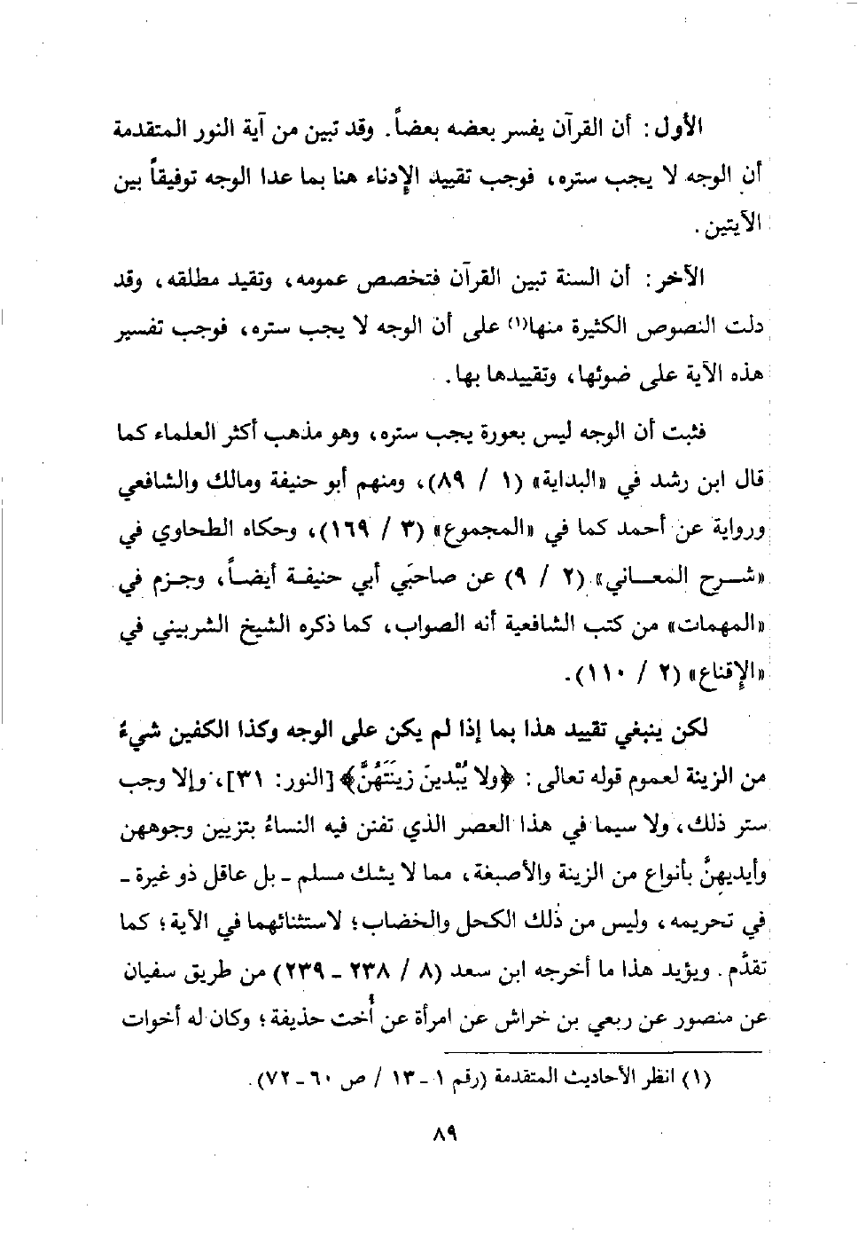 لكن ينبغي تقييد هذا بما إذا لم يكن على الوجه وكذا الكفين شيء من الزينة لعموم قوله تعالى: {وَلا يُبْدِينَ زِينَتَهُنَّ} [النور: 31] وإلا وجب ستر ذلك ولا سيما في هذا العصر الذي تفنن فيه النساء بتزيين وجوههن وأيديهن بأنواع من الزينة والأصبغة مما لا يشك مسلم -بل عاقل ذو غيرة- في تحريمه وليس من ذلك الكحل والخضاب لاستثنائهما في الآية كما تقدم. ويؤيد هذا ما أخرجه ابن سعد "8/ 238 - 239" من طريق سفيان عن منصور عن ربعي بن خراش عن امرأة عن أخت حذيفة وكان له أخوات