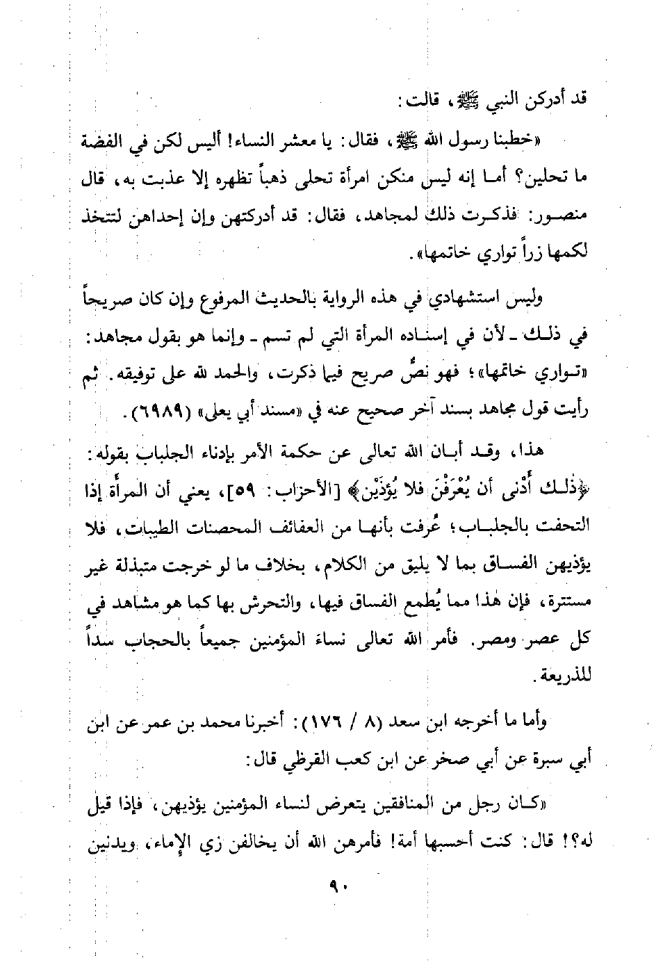 خطبنا رسول الله -صلى الله عليه وسلم- فقال: "يا معشر النساء أليس لكن في الفضة ما تحلين؟ أما إنه ليس منكن امرأة تحلى ذهبًا تظهره إلا عذبت به"، قال منصور: فذكرت ذلك لمجاهد فقال: قد أدركتهن وإن إحداهن لتتخذ لكمها زرًّا تواري خاتمها.