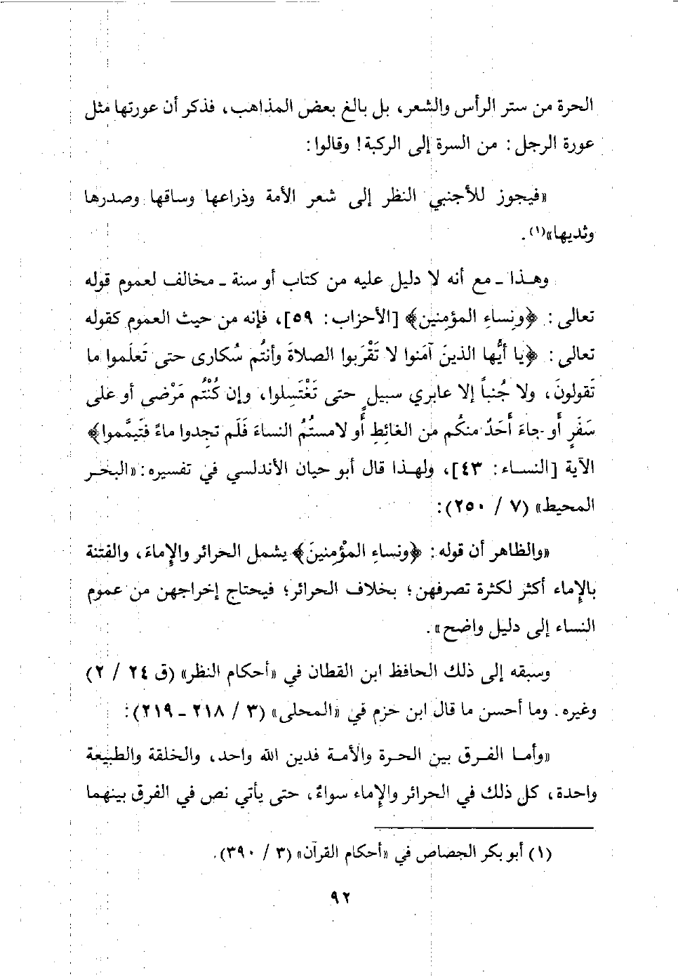 وهذا -مع أنه لا دليل عليه من كتاب أو سنة- مخالف لعموم قوله تعالى: {وَنِسَاءِ الْمُؤْمِنِينَ} [الأحزاب: 59] فإنه من حيث العموم كقوله تعالى: {يَا أَيُّهَا الَّذِينَ آَمَنُوا لَا تَقْرَبُوا الصَّلَاةَ وَأَنْتُمْ سُكَارَى حَتَّى تَعْلَمُوا مَا تَقُولُونَ وَلَا جُنُبًا إِلَّا عَابِرِي سَبِيلٍ حَتَّى تَغْتَسِلُوا وَإِنْ كُنْتُمْ مَرْضَى أَوْ عَلَى سَفَرٍ أَوْ جَاءَ أَحَدٌ مِنْكُمْ مِنَ الْغَائِطِ أَوْ لَامَسْتُمُ النِّسَاءَ فَلَمْ تَجِدُوا مَاءً فَتَيَمَّمُوا} الآية [النساء: 43] ولهذا قال أبو حيان الأندلسي في تفسيره: "البحر المحيط" "7/ 250":