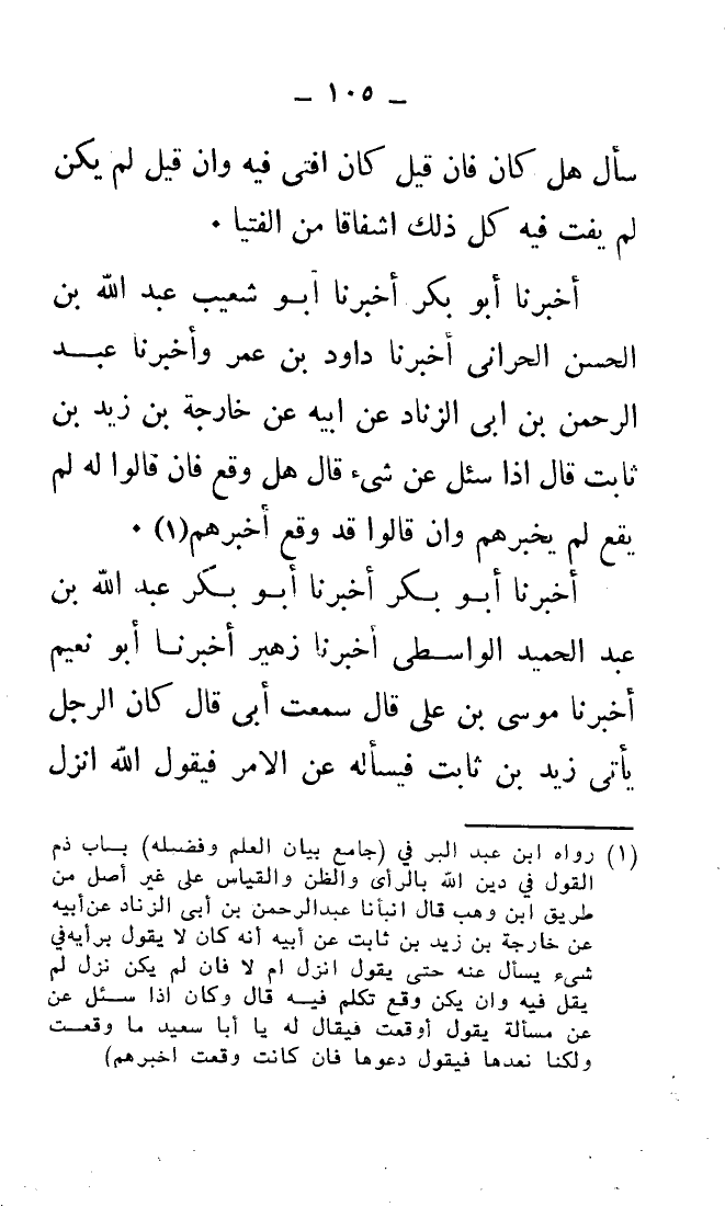 أَخْبَرَنَا أَبُو بَكْرٍ أَخْبَرَنَا أَبُو شُعَيْبٍ عَبْدُ اللَّهِ بْنُ الْحَسَنِ الْحَرَّانِيُّ , أَخْبَرَنَا دَاوُدُ بْنُ عَمْرٍو , أَخْبَرَنَا عَبْدُ الرَّحْمَنِ بْنُ أَبِي الزِّنَادِ , عَنْ أَبِيهِ , عَنْ خَارِجَةَ بْنِ زَيْدِ بْنِ ثَابِتٍ , " كَانَ §إِذَا سُئِلَ عَنْ شَيْءٍ قَالَ: هَلْ وَقَعَ؟ فَإِنْ قَالُوا لَهُ: لَمْ يَقَعْ , لَمْ يُخْبِرْهُمْ , وَإِنْ قَالُوا: قَدْ وَقَعَ , أَخْبَرَهُمْ "