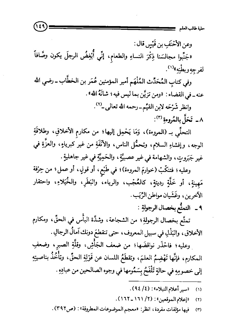 التحلي بـ (المروءة) ، وما يحمل إليها، من مكارم الأخلاق، وطلاقة الوجه، وإفشاء السلام، وتحمل الناس، والأنفة من غير كبرياء، والعزة في غير جبروت، والشهامة في غير عصبية، والحمية في غير جاهلية. وعليه فتنكب (خوارم المروءة) ، في طبع، أو قول، أو عمل، من حرفة مهينة، أو خلة رديئة، كالعجب، والرياء، والبطر، والخيلاء، واحتقار الآخرين، وغشيان مواطن الريب.