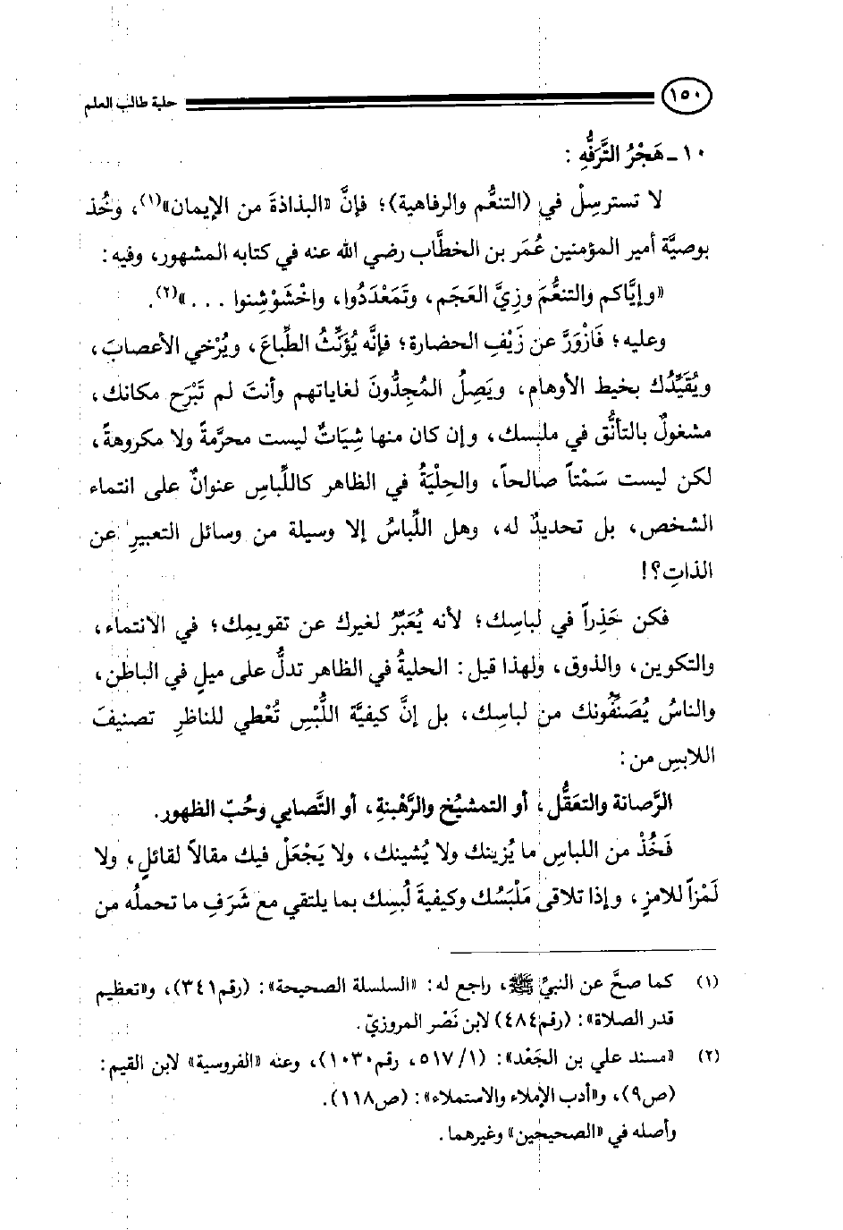 لا تسترسل في (التنعم والرفاهية) ، فإن "البذاذة من الإيمان" (¬1) ، وخذ بوصية أمير المؤمنين عمر بن الخطاب رضى الله عنه في كتابه المشهور، وفيه: