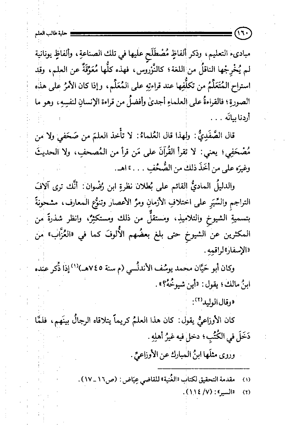 مبادئ التعليم، وذكر ألفاظ مصطلح عليه في تلك الصناعة، وألفاظ يونانية لم يخرجها الناقل من اللغة، كالنوروس، فهذه كلها معوقة عن العلم، وقد استراح المتعلم من تكلفها عند قراءته على المعلم، وإذا كان الأمر على هذه الصورة، فالقراءة على العلماء أجدى وأفضل من قراءة الإنسان لنفسه، وهو ما أردنا بيانه 00 قال الصفدي: ولهذا قال العلماء: لا تأخذ العلم من صحفي ولا من مصحفي، يعنى: لا تقرأ القرآن على من قرأ من المصحف ولا الحديث وغيره على من أخذ ذلك من الصحف 000"اهـ.