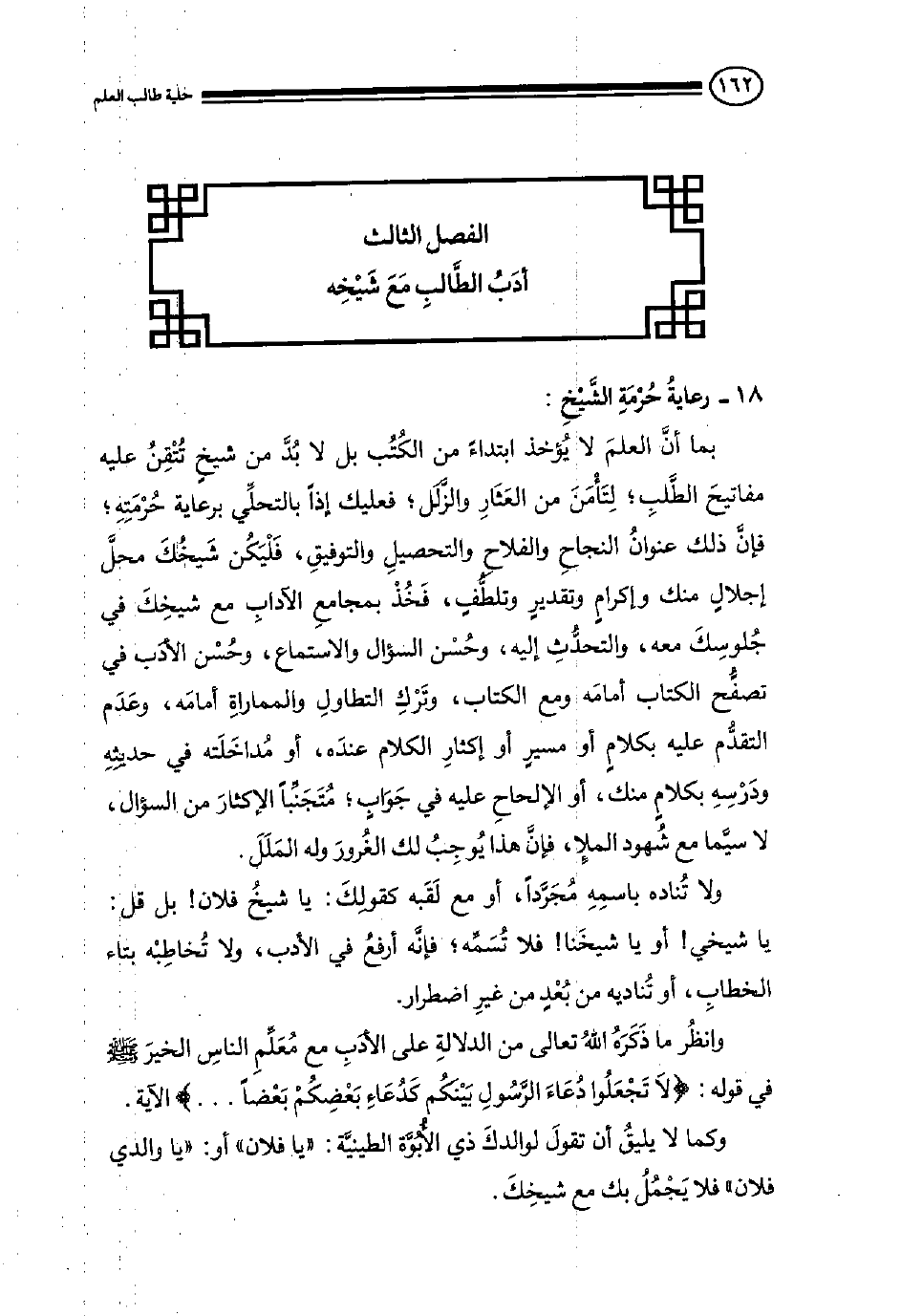 بما أن العلم لا يؤخذ ابتداء من الكتب بل لا بد من شيخ تتقن عليه مفاتيح الطلب، لتأمن من العثار والزلل، فعليك إذاً بالتحلي برعاية حرمته، فإن ذلك عنوان النجاح والفلاح والتحصيل والتوفيق، فليكن شيخك محل إجلال منك وإكرام وتقدير وتلطف، فخذ بمجامع الآداب مع شيخك في جلوسك معه، والتحدث إليه، وحسن السؤال والاستماع، وحسن الأدب في تصفح الكتاب أمامه ومع الكتاب، وترك التطاول والمماراة أمامه، وعدم التقدم عليه بكلام أو مسير أو إكثار الكلام عنده، أو مداخلته في حديثه ودرسه بكلام منك، أو الإلحاح عليه في جواب، متجنباً الإكثار من السؤال، ولا سيما مع شهود الملأ، فإن هذا يوجب لك الغرور وله الملل.