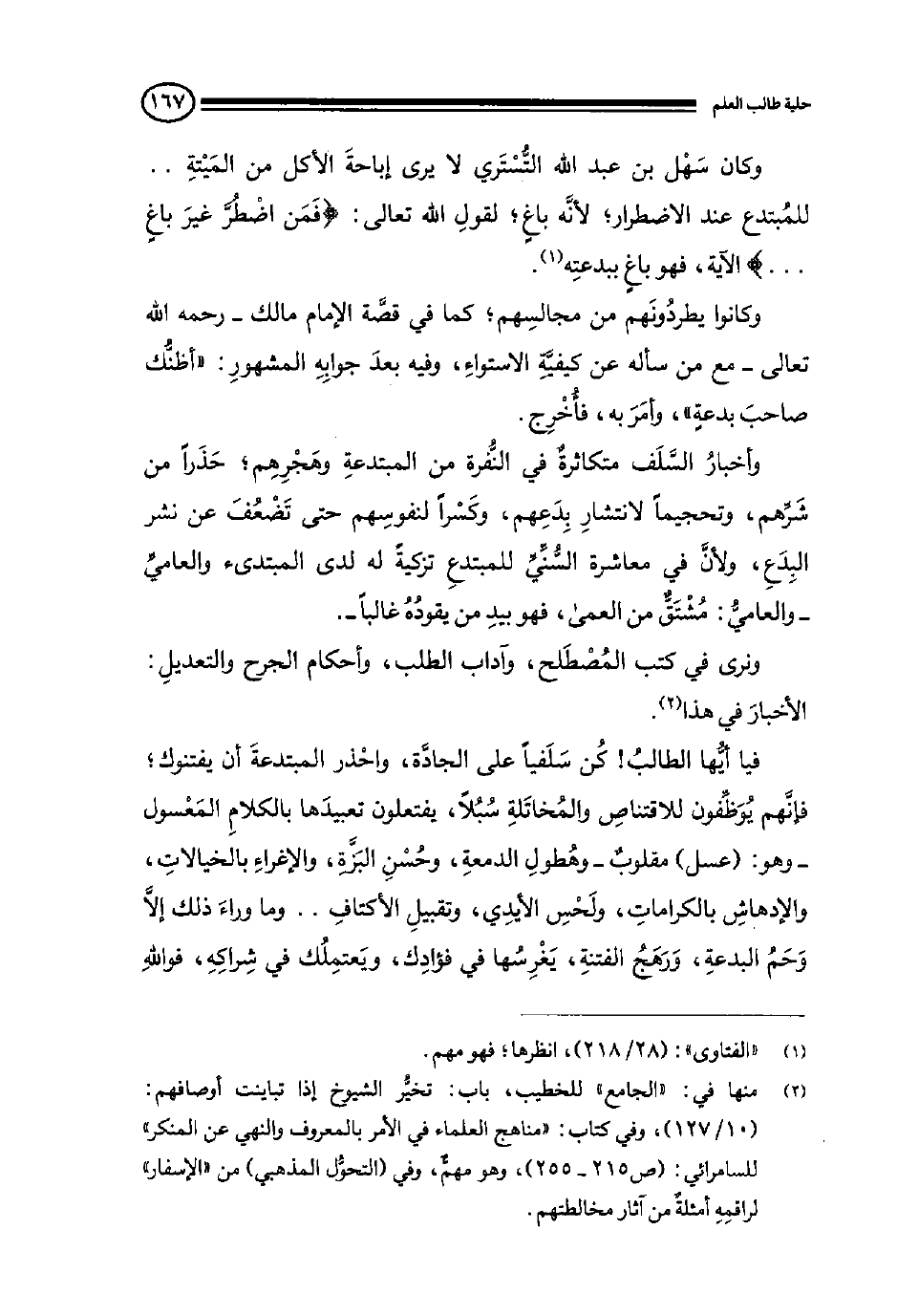فيا أيها الطالب! كن سلفيا على الجادة، واحذر المبتدعة أن يفتنوك، فإنهم يوظفون للاقتناص والمخاتلة سبلا، يفتعلون تعبيدها بالكلام المعسول - وهو: (عسل) مقلوب - وهطول الدمعة، وحسن البزة، والإغراء الخيالات، والإدهاش بالكرامات، ولحس الأيدي، وتقبيل الأكتاف 00 وما وراء ذلك إلا وحم البدعة، ورهج الفتنة، يغرسها في فؤادك، ويعتملك في شراكه، فوالله