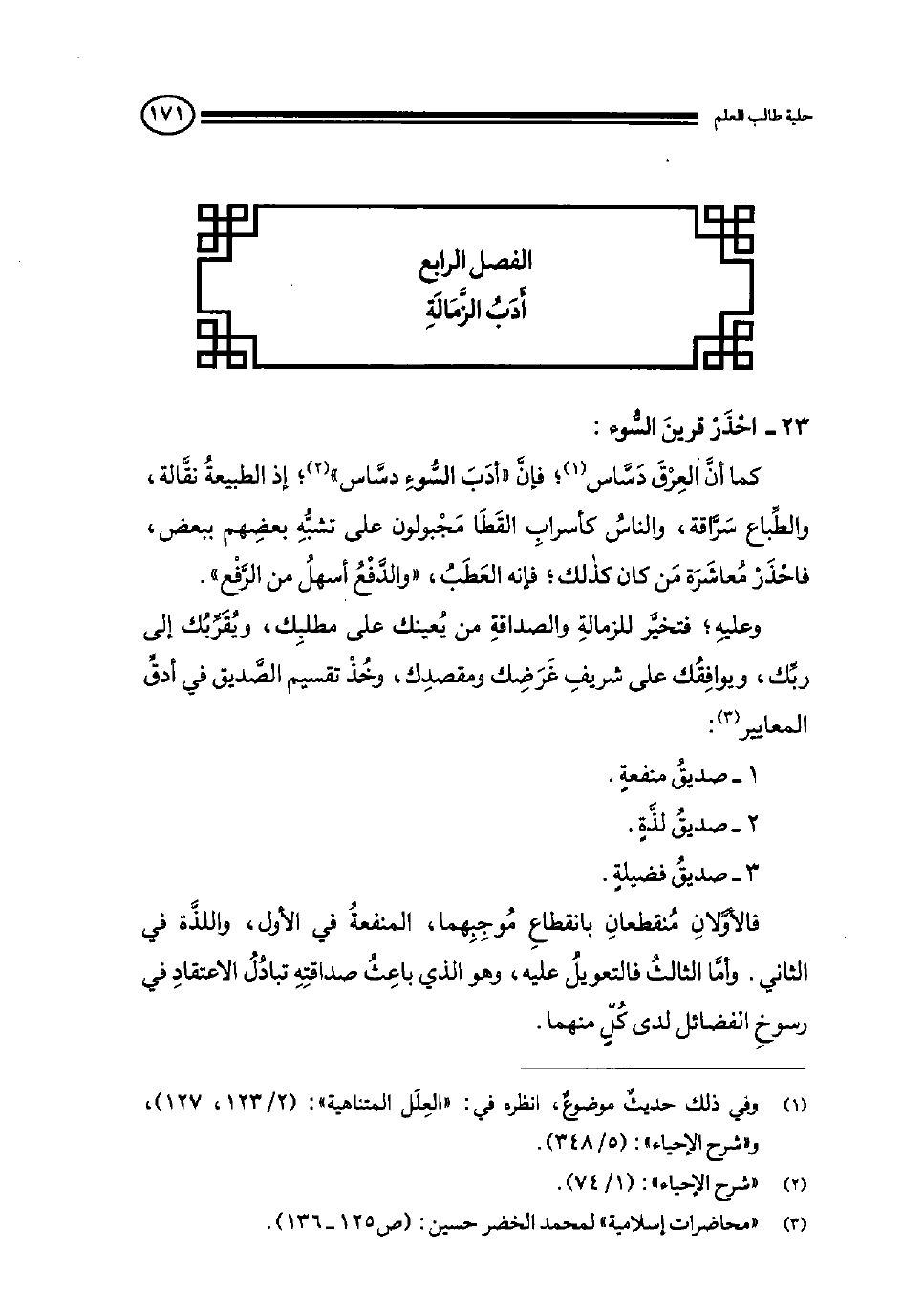 وعليه، فتخير للزمالة والصداقة من يعينك على مطلبك، ويقربك إلى ربك ويوافقك على شريف غرضك ومقصدك وخذ تقسيم الصديق في أدق المعايير (¬3) :