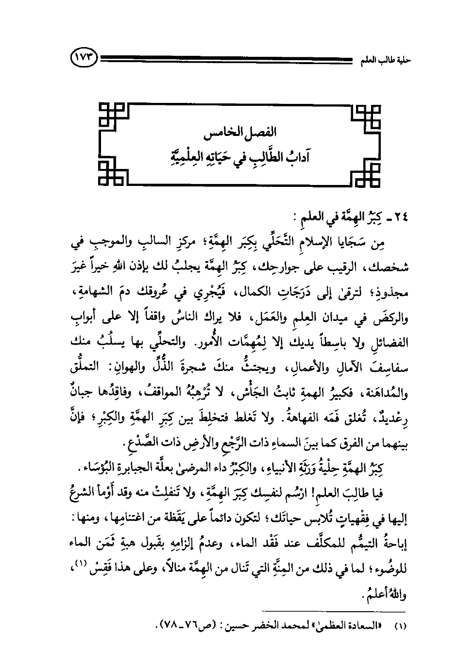 فيا طالب العلم ارسم لنفسك كبر الهمة، ولا تنفلت منه وقد أومأ الشرع إليها في فقهيات تلابس حياتك، لتكون دائماً على يقظة من اغتنامها، ومنها: إباحة التيمم للمكلف عند فقد الماء، وعدم إلزامه بقبول هبة ثمن الماء للوضوء، لما في ذلك من المنة التي تنال من الهمة منالاً، وعلى هذا فقس (¬1) ، والله أعلم.