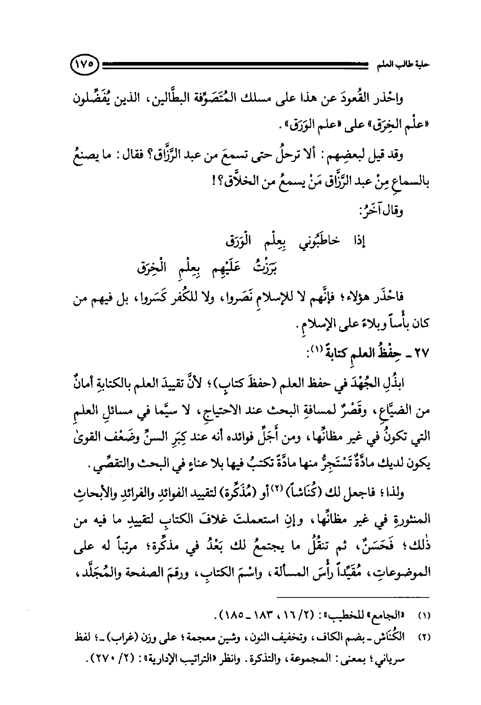 ابذل الجهد في حفظ العلم (حفظ كتاب) ، لأن تقييد العلم بالكتابة أمان من الضياع، وقصر لمسافة البحث عند الاحتياج، لا سيما في مسائل العلم التي تكون في غير مظانها، ومن أجل فوائده أنه عند كبر السن وضعف القوى يكون لديك مادة تستجر منها مادة تكتب فيها بلا عناء في البحث والتقصي.