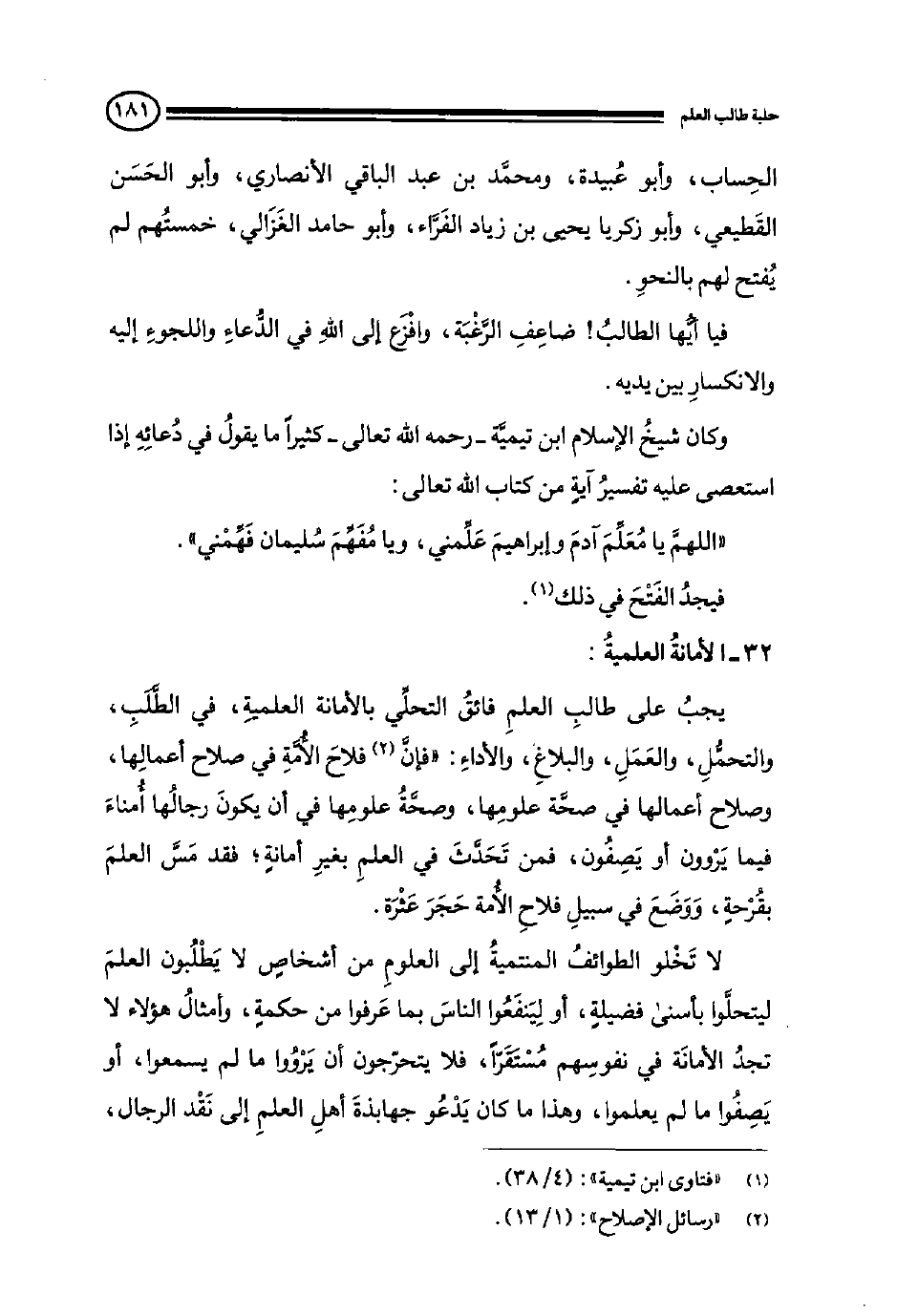 يجب على طالب العلم فائق التحلي بالأمانة العلمية، في الطلب، والتحمل والعمل والبلاغ، والأداء: