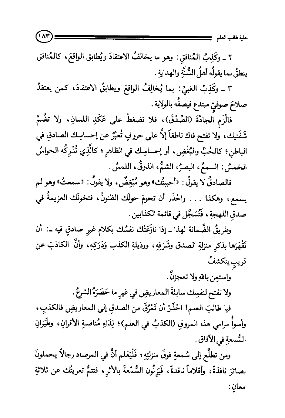 فيا طالب العلم! احذر أن تمرق من الصدق إلى المعاريض فالكذب، وأسوأ مرامي هذا المروق (الكذب في العلم) لداء منافسة الأقران، وكيران السمعة في الآفاق.
