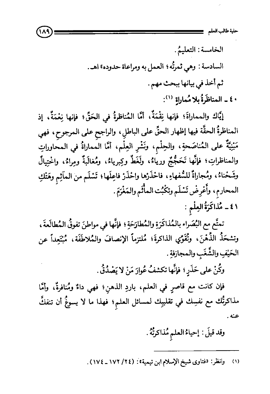 فإن كانت مع قاصر في العلم، بارد الذهن، فهي داء ومنافرة وأما مذاكرتك مع نفسك في تقليبك لمسائل العلم؛ فهذا ما لا يسوغ أن تنفك عنه.