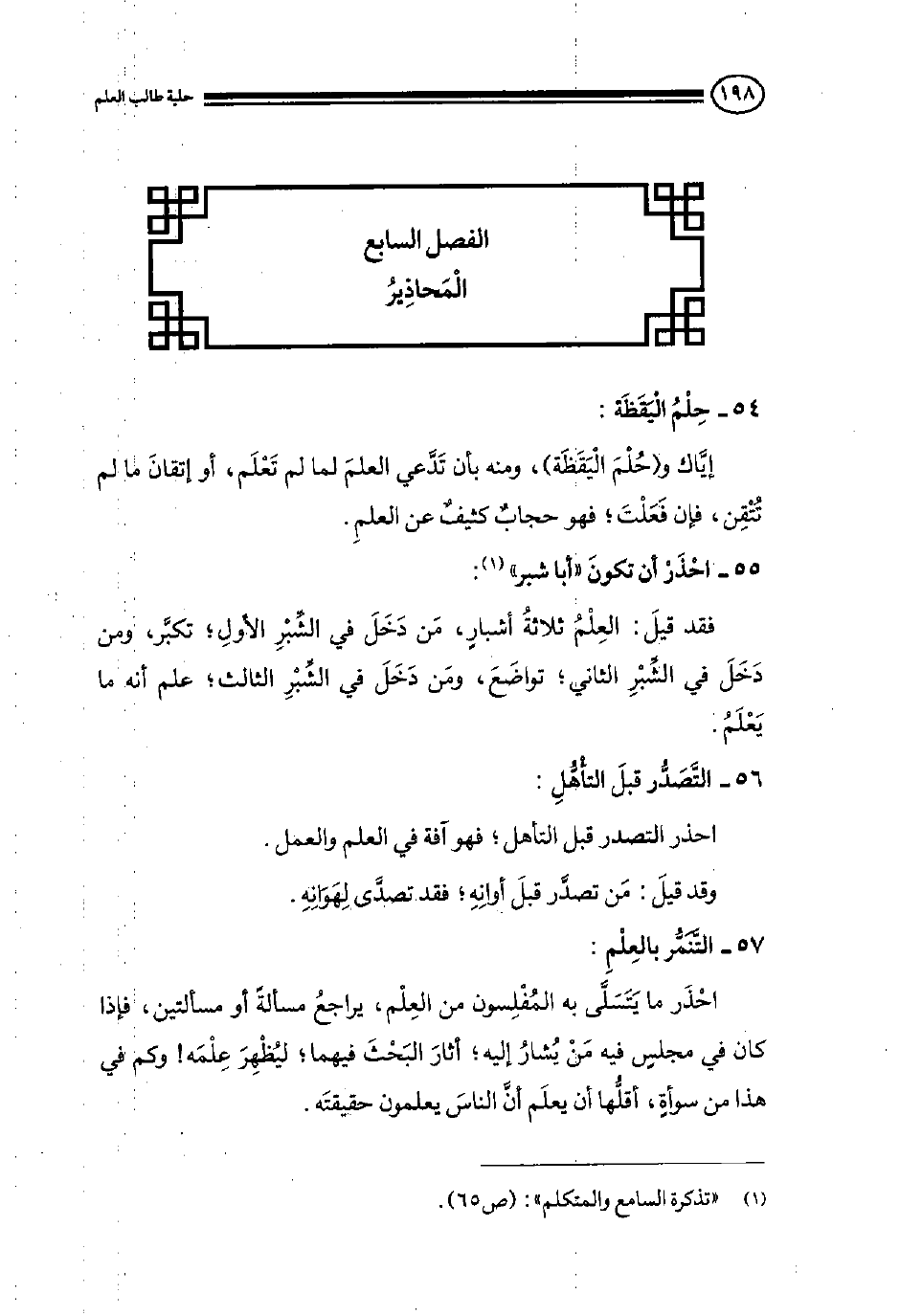 احذر ما يتسلى به المفلسون من العلم، يراجع مسألة أو مسألتين، فإذا كان في مجلس فيه من يشار إليه، أثار البحث فيهما، ليظهر علمه! وكم في هذا من سوءة، أقلها أن يعلم أن الناس يعلمون حقيقته.