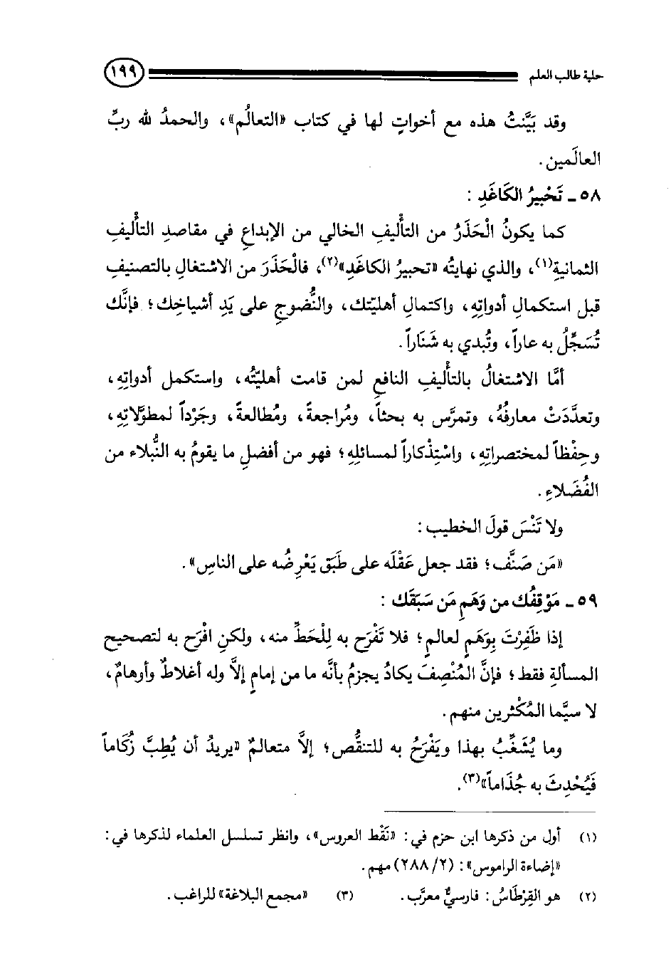 كما يكون الحذر من التأليف الخالي من الإبداع في مقاصد التأليف الثمانية (¬1) ، والذي نهايته "تحبير الكاغد" (¬2) فالحذر من الاشتغال بالتصنيف قبل استكمال أدواته، واكتمال أهليتك، والنضوج على يد أشياخك، فإنك تسجل به عاراً وتبدى به شناراً.