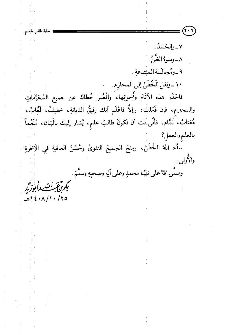 فاحذر هذه الآثام وأخواتها واقصر خطاك عن جميع المحرمات فإن فعلت وإلا فاعلم أنك رقيق الديانة خفيف لعاب مغتاب نمام فأن لك أن تكون طالب علم يشار إليك بالبنان منعماً بالعلم والعمل.