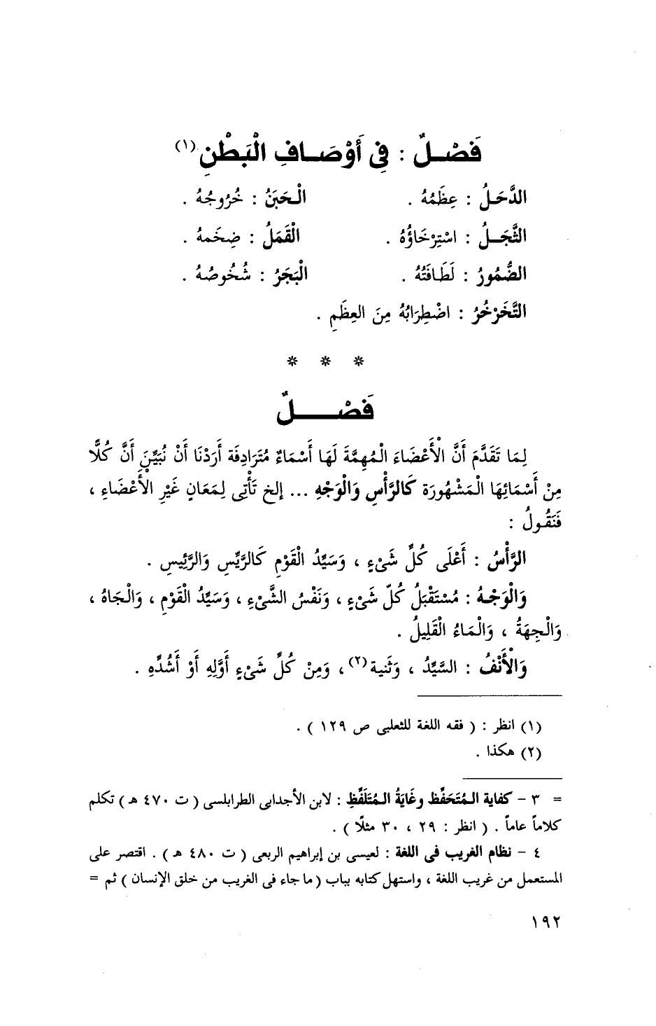 لما تقدم أَن الْأَعْضَاء المهمة لَهَا أَسمَاء مترادفة أردنَا أَن نبين أَن كلا من أسمائها الْمَشْهُورَة كالرأس وَالْوَجْه إِلَخ تَأتي لمعان غير الْأَعْضَاء فَنَقُول