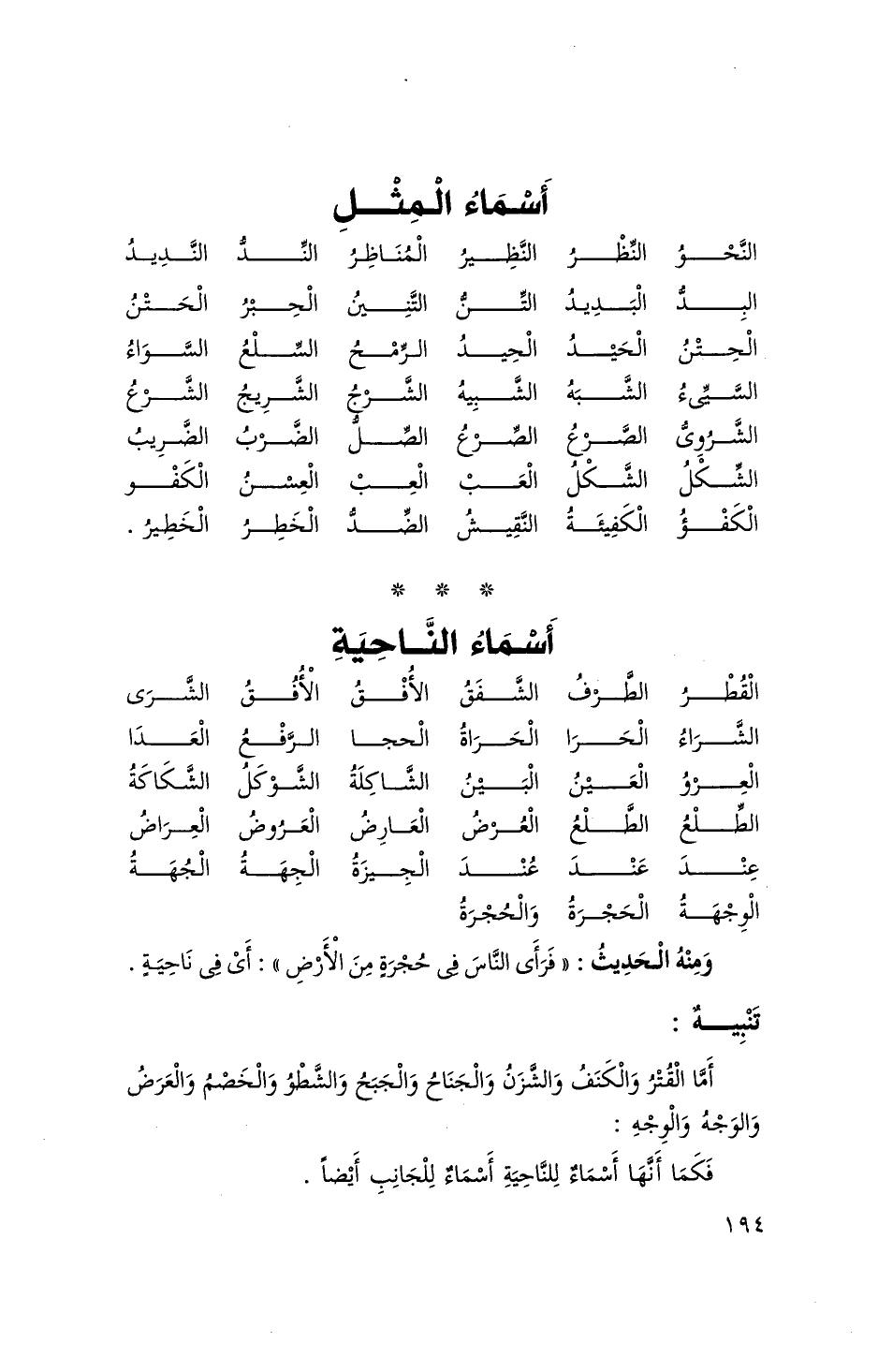 والجناح والجبح والشطو والخصم وَالْعرض وَالْوَجْه وَالْوَجْه فَكَمَا أَنَّهَا أَسمَاء للناحية أَسمَاء للجانب أَيْضا