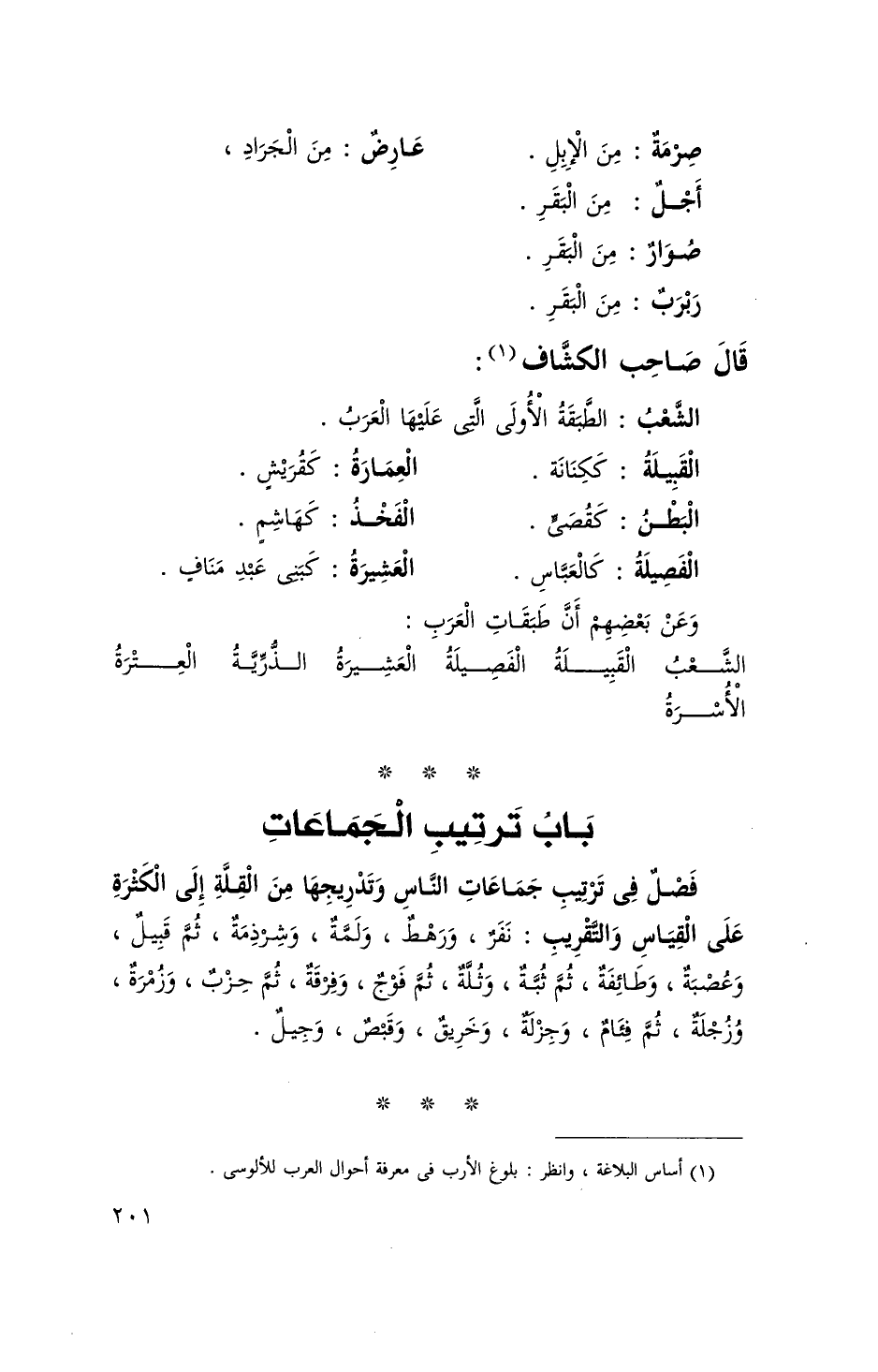 فصل فِي تَرْتِيب جماعات النَّاس وتدريجها من الْقلَّة إِلَى الْكَثْرَة على الْقيَاس والتقريب