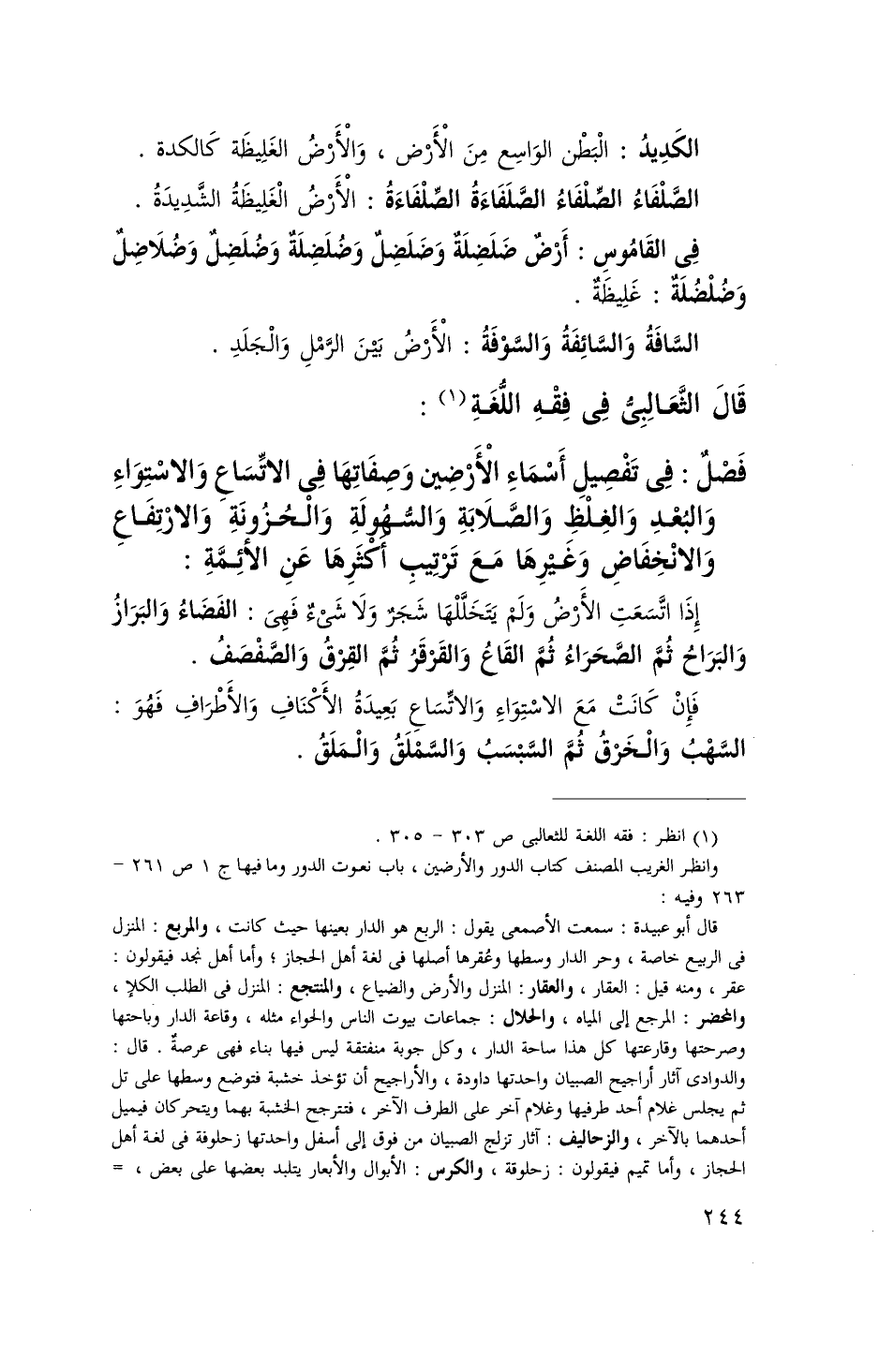 فصل فِي تَفْصِيل أَسمَاء الْأَرْضين وصفاتها فِي الاتساع والاستواء والبعد والغلظ والصلابة والسهولة والحزونة والارتفاع والانخفاض وَغَيرهَا مَعَ تَرْتِيب أَكْثَرهَا عَن الْأَئِمَّة