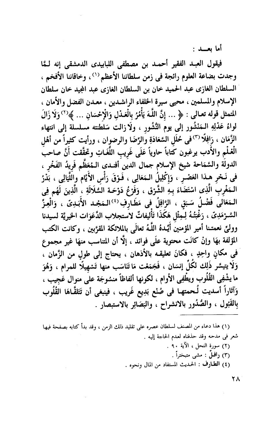 فَيَقُول العَبْد الْفَقِير أَحْمد بن مصطفى اللبابيدى الدمشقى إِنَّه لما وجدت بضَاعَة الْعُلُوم رائجة فِي زمن سلطاننا الْأَعْظَم وخاقاننا الأفخم السُّلْطَان الغازى عبد الحميد خَان بن السُّلْطَان الغازى عبد الْمجِيد خَان سُلْطَان الْإِسْلَام وَالْمُسْلِمين محيى سيرة الْخُلَفَاء الرَّاشِدين مَعْدن الْفضل والأمان المتمثل قَوْله تَعَالَى {إِن الله يَأْمر بِالْعَدْلِ وَالْإِحْسَان} وَلَا زَالَ لِوَاء عدله المنشور إِلَى يَوْم النشور وَلَا زَالَت سلطنته مسلسلة إِلَى انْتِهَاء الزَّمَان رافلا فِي حلل السَّعَادَة وَالرِّضَا والرضوان ورايت كثيرا من أهل الْعلم وَالْأَدب يرغبون كتابا حاويا على غَرِيب اللُّغَات وتحققت أَن صَاحب الدولة والسماحة شيخ الْإِسْلَام جمال الدّين افندى الْمُعظم فريد الْفَخر فِي نحر هَذَا الْعَصْر وإكليل المعالى فَوق رَأس الْأَيَّام والليالى بدر الْمغرب الذى استضاء بِهِ الشرق وَفرع دوحة السلالة الَّذين لَهُم فِي المعالى فضل سبق الرافل فِي مطارف الْمجد الأبدى والعز السرمدى رغبته لمثل هَكَذَا تَأْلِيفَات لاستجلاب الدَّعْوَات الْخَيْرِيَّة لسيدنا وَولى نعمتنا أَمِير الْمُؤمنِينَ أيده الله تَعَالَى بِالْمَلَائِكَةِ المقربين وَكَانَت الْكتب الْمُؤَلّفَة بهَا وَإِن كَانَت محتوية على فَوَائِد إِلَّا أَن المتناسب مِنْهَا غير مَجْمُوع فِي مَكَان وَاحِد فَكَانَ تَعْلِيقه بالأذهان يحْتَاج إِلَى طول من الزَّمَان وَلَا يَتَيَسَّر ذَلِك لكل إِنْسَان فَجمعت مَا تناسب مِنْهَا تسهيلا للمرام وَهُوَ مَا يشفى الْقُلُوب ويطفى الأوام لكَونهَا ألفاظا منسوجة على منوال عَجِيب وآثاراء اسديت لحمتها فِي صنع بديع غَرِيب فينبغى أَن تتلقاها الْقُلُوب بِالْقبُولِ والصدور بالانشراح والبصائر بالاستبصار