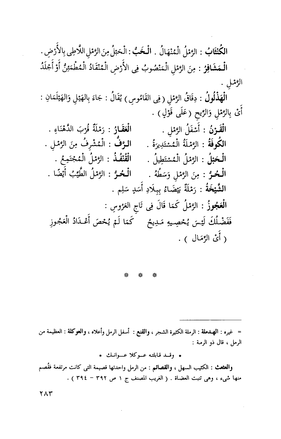 الرمل كَمَا قَالَ فِي تَاج الْعَرُوس ففضلك لَيْسَ يُحْصِيه مديح كَمَا لم يحص أعداد الْعَجُوز أى الرمال