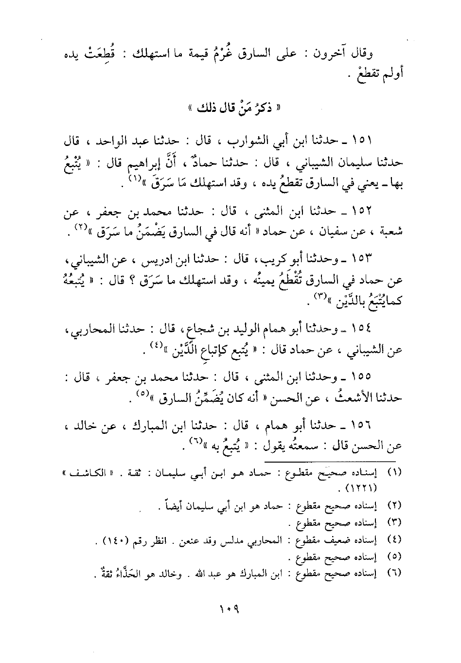 151 - حَدثنَا ابْن أبي الشَّوَارِب، قَالَ: حَدثنَا عبد الْوَاحِد، قَالَ حَدثنَا سُلَيْمَان الشَّيْبَانِيّ، قَالَ: حَدثنَا حَمَّاد، أَن إِبْرَاهِيم قَالَ: " يتبع بهَا - يَعْنِي فِي السَّارِق تقطع يَده، وَقد اسْتهْلك مَا سرق ".